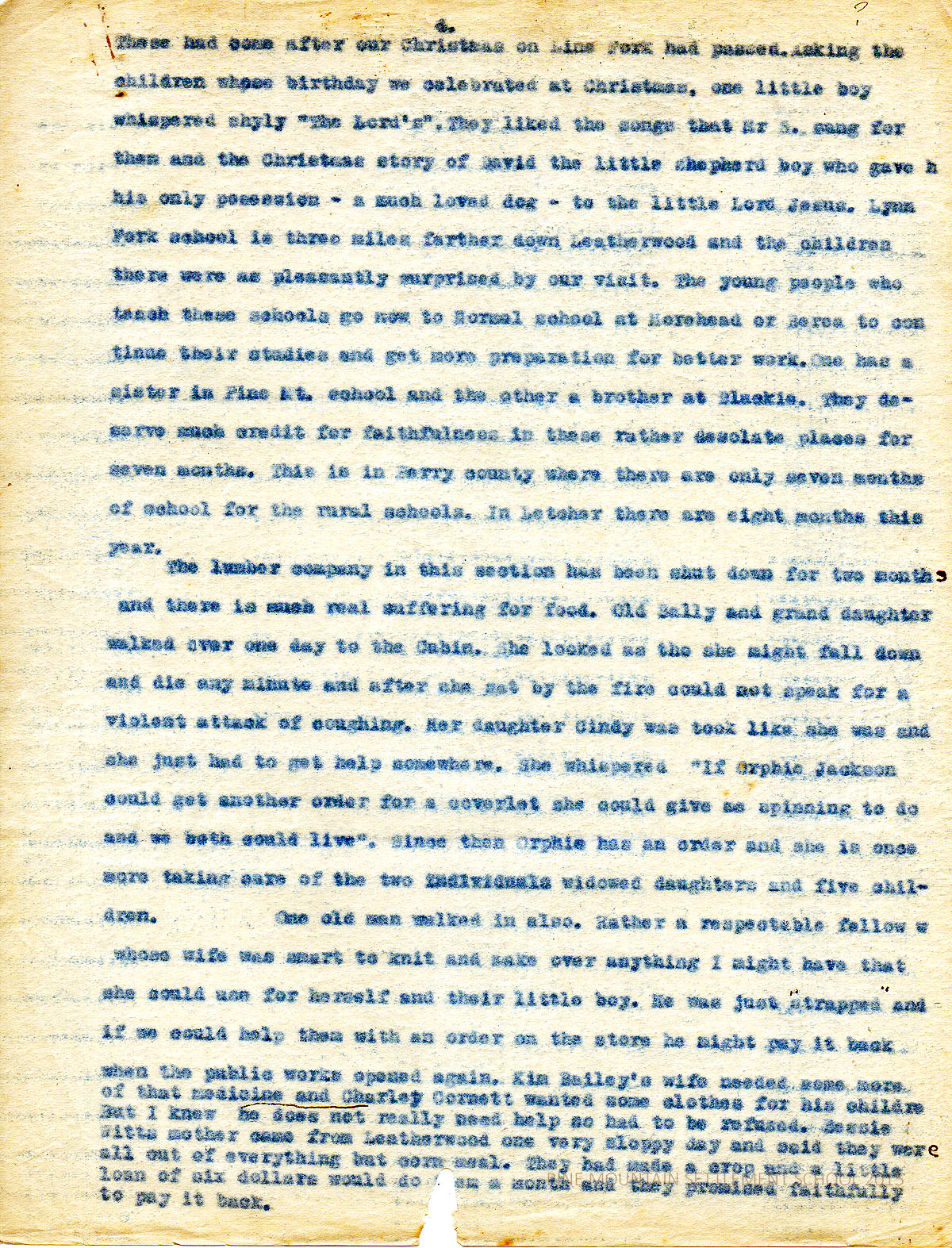 One old man walked in also. Rather a respectable fellow whose wife was smart to knit and make over anything she could use for herself and their little boy. He was just “strapped” and if we could help them with an order on the store he might pay it back when the public works opened again. Kim Bailey’s wife needed some more of that medicine and Charley Cornett wanted some clothes for his children. But I knew he does not really need help so had to be refused. Bessie Witts mother came from Leatherwood one very sloppy day and said they were all out of everything but corn meal. They had made a crop and a little loan of six dollars would do them a month and they promised faithfully to pay it back.