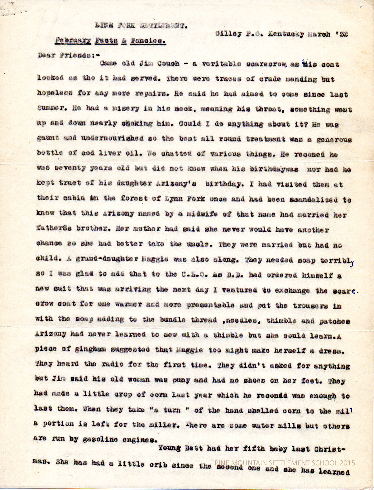 TAGS: STAPLETON REPORT – March 1932 “Came Old Jim Couch — a veritable scarecrow …” ; Line Fork Settlement ; Dr. Ida Stapleton ; Jim Couch ; Arizony Couch ; Cambellite preachers ; Bennet and Lory Hall ; Alec Boggs ; Bish Boggs ; revival meetings ; baptisms ; Dick Smith ; Mrs. John Holcomb ; whiskey stills ; doctor visits ; diphtheria
