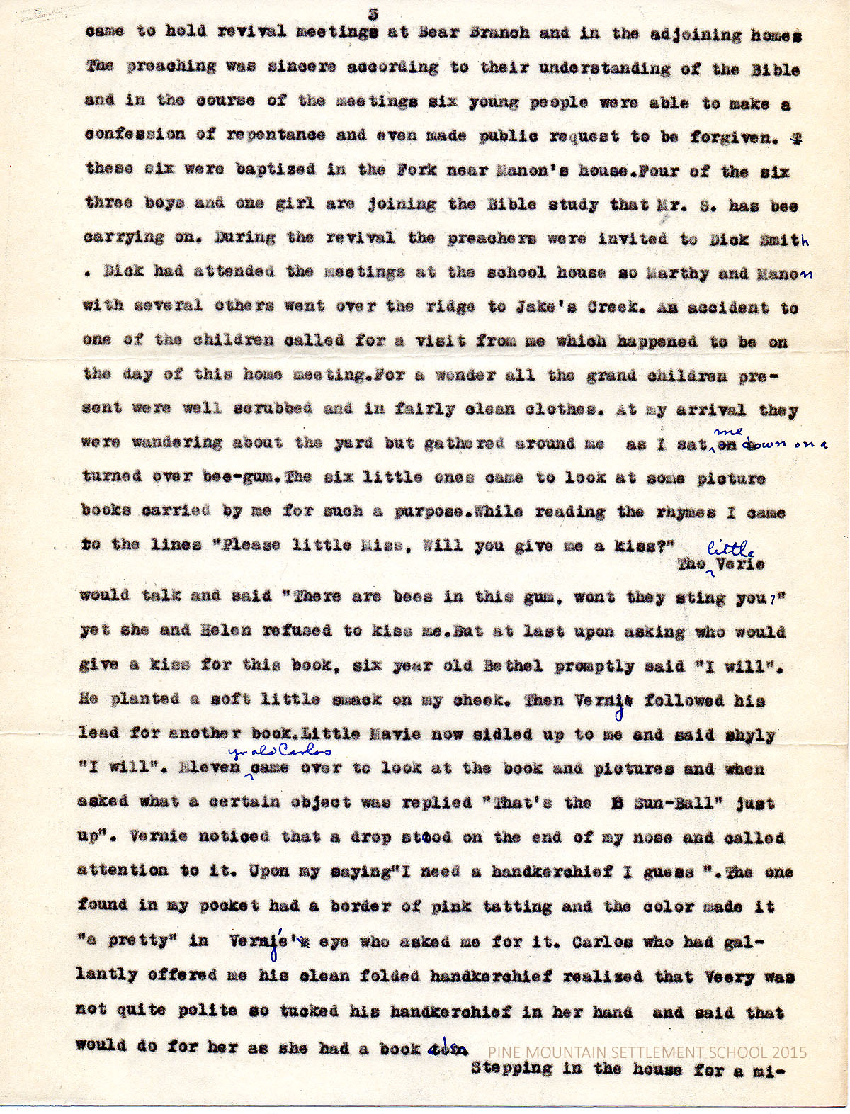 Another sect the Holiness a bit jealous of the new additions to the Campbellites came to hold revival meetings at Bear Branch and in the adjoining homes. The preaching was sincere according to their understanding of the Bible and in the course of the meetings six young people were able to make a confession of repentance and even made public request to be forgiven. These six were baptized in the Fork near Manon’s house. Four of the six, three boys and one girl, are joining the Bible study that Mr. S has been carrying on. During the revival the preachers were invited to Dick Smith’s. Dick had attended the meetings at the school house so Marthy and Manon with several others went over the ridge to Jake’s Creek. An accident to one of the children called for a visit from me which happened to be on the day of this home meeting. For a wonder all the grandchildren present were well scrubbed and in fairly clean clothes. At my arrival they were wandering about the yard but gathered around me as I sat me down on a turned over bee-gum. The six little ones came to look at some picture books carried by me for such a purpose. While reading the rhymes I came to the lines “Please little Miss, Will you give me a kiss?”