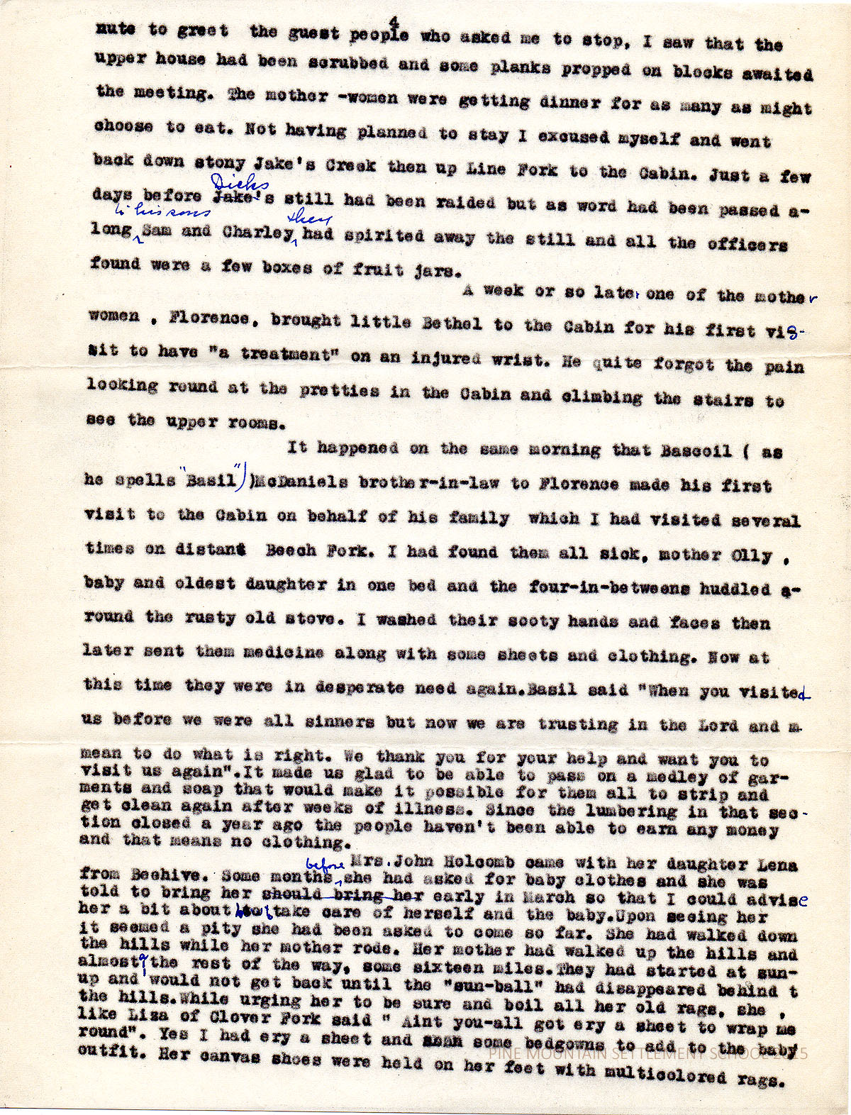 It happened on the same morning that Bascoil (as he spells “Basil”) McDaniel’s brother-in-law to Florence made his first visit to the Cabin on behalf of his family which I had visited several times on distant Beech Fork. I had found them all sick, mother Olly, baby and oldest daughter in one bed and the four-in-betweens huddled around the rusty old stove. I washed their sooty hands and faces then later sent them medicine along with some sheets and clothing. Now at this time they were in desperate need again. Basil said, “When you visited us before we were all sinners but now we are trusting in the Lord and mean to do what is right. We thank you for your help and want you to visit us again”. It made us glad to be able to pass on a medley of garments and soap that would make it possible for them all to strip and get cleaned again after weeks of illness. Since the lumbering in that section closed a year ago the people haven’t been able to earn any money and that means no clothing.
