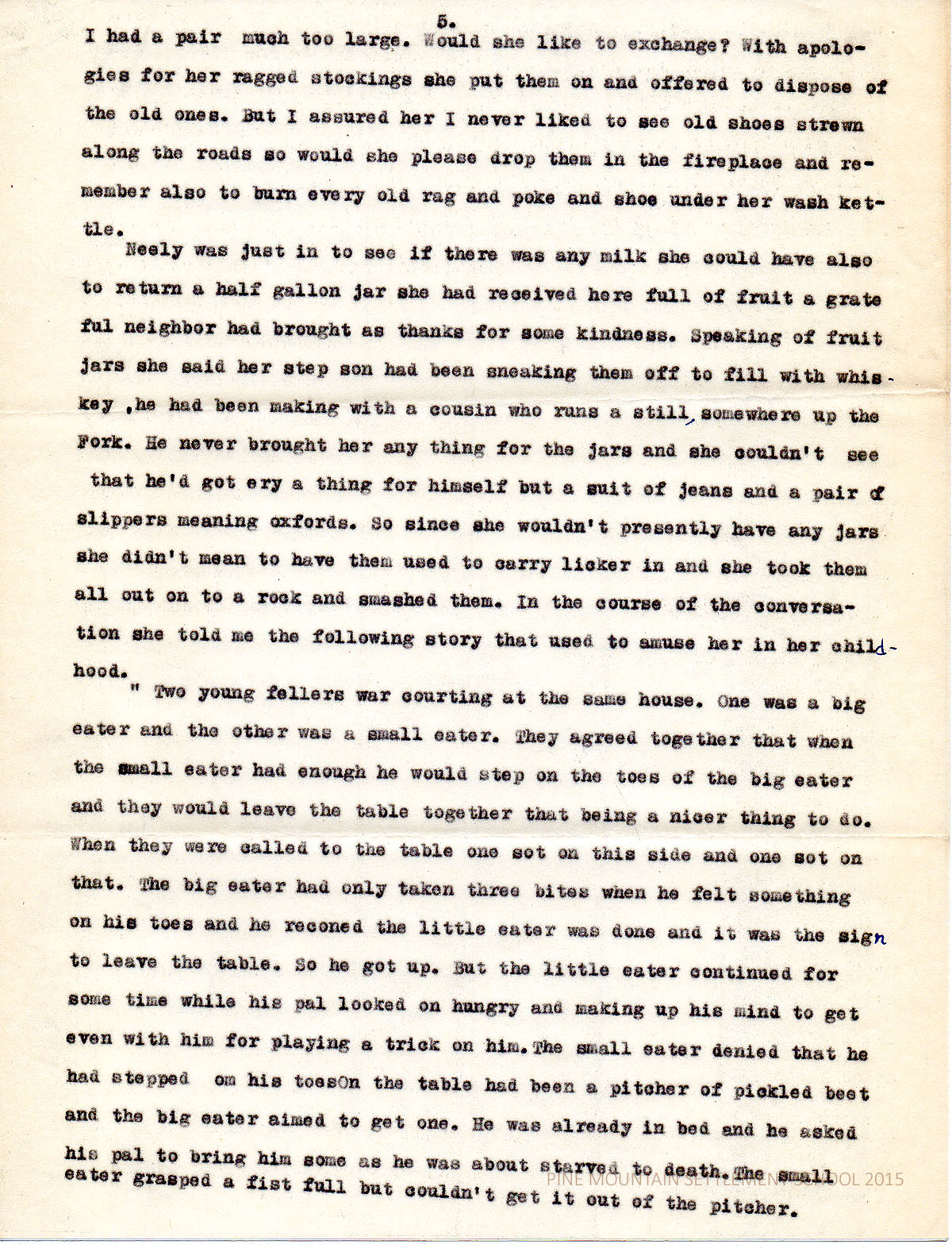 “Two young fellers war courting at the same house. One was a big eater and the other was a small eater. They agreed together that when the small eater had enough he would step on the toes of the big eater and they would leave the table together that being a nicer thing to do. When they were called to the table one sot on this side and one sot on that. The big eater had only taken three bites when he felt something on his toes and he reckoned the little eater was done and it was the sign to leave the table. So he got up. But the little eater continued for some time while his pal looked on hungry and making up his mind to get even with him for playing a trick on him. The small eater denied that he had stepped on his toes. On the table had been a pitcher of pickled beet and the big eater aimed to get one. He was already in bed and he asked his pal to bring him some as he was about starved to death. The small eater grabbed a fist full but couldn’t get it out of the pitcher. Not having the wit to open his hand he didn’t know what to do and his pal could think of nothing but sending him out to break the pitcher on a rock which he went out to do. In the dusky dark he thought he saw a stump and whacked the pitcher on that. Instead of the stump it appeared to be the old granny of the house and she cried out, “I’m murdered. I’m murdered” as she was rescued from broken pitcher, beets and vinegar. The laugh was on the sillies.”