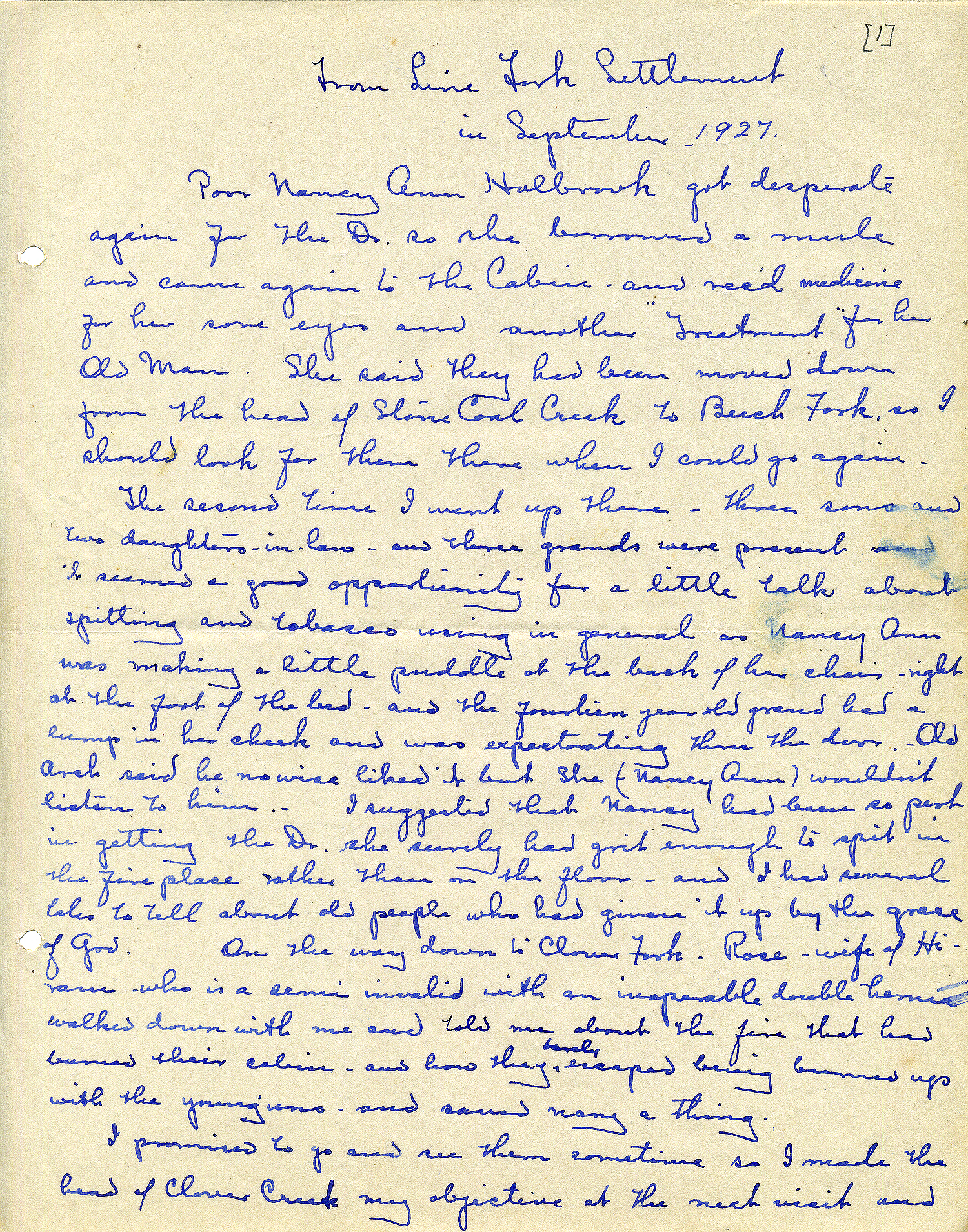The second time I went up there – three sons and two daughters-in-law – and three grands were present and it seemed a good opportunity for a little talk about spitting and tobacco using in general as Nancy Ann was making a little puddle at the back of the chair – right at the foot of the bed – and the fourteen year old grand had a lump in her cheek and was expectorating thru the door. Old Arch said he no wise liked it but She (Nancy Ann) wouldn’t listen to him. I suggested that Nancy had been so pert in getting the Dr she surely had grit enough to spit in the fireplace rather than on the floor- and I had several tales to tell about old people who had given it up by the grace of God. On the way down to Clover Fork, Rose – wife of Hiram who is a semi-invalid with an inoperable double hernia – walked down with me and told me about the fire that had burned their cabin – and how they barely escaped being burned up with the young’uns – and saved nary a thing.