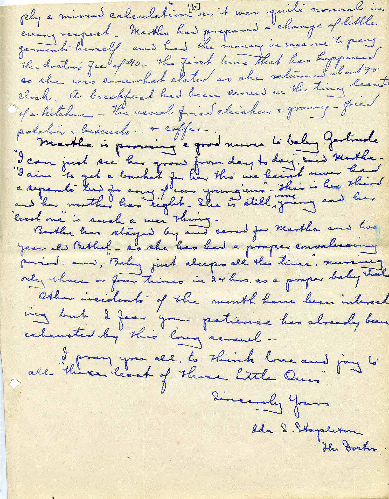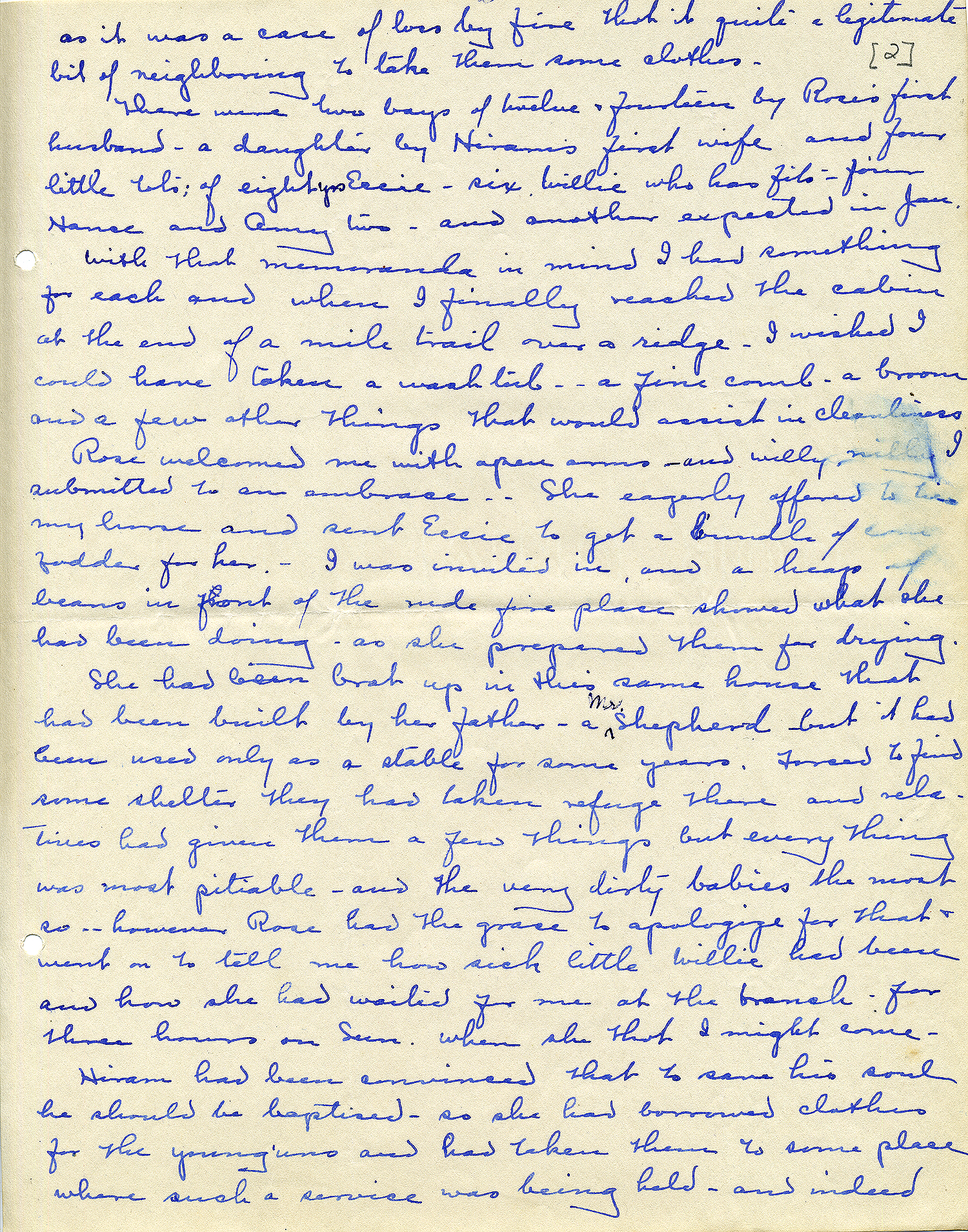 She had been brot [sic] up in this same house that had been built by her father – a Mr Shepherd – but it had been used only as a stable for some years. Forced to find some shelter they had taken refuge there and relatives had given them a few things but everything was most pitiable – and the very dirty babies the most so – however Rose had the grace to apologize for that and went on to tell me how sick little Willie had been and how she had waited for me at the branch for three hours on Sun[day] when she thot that I might come.