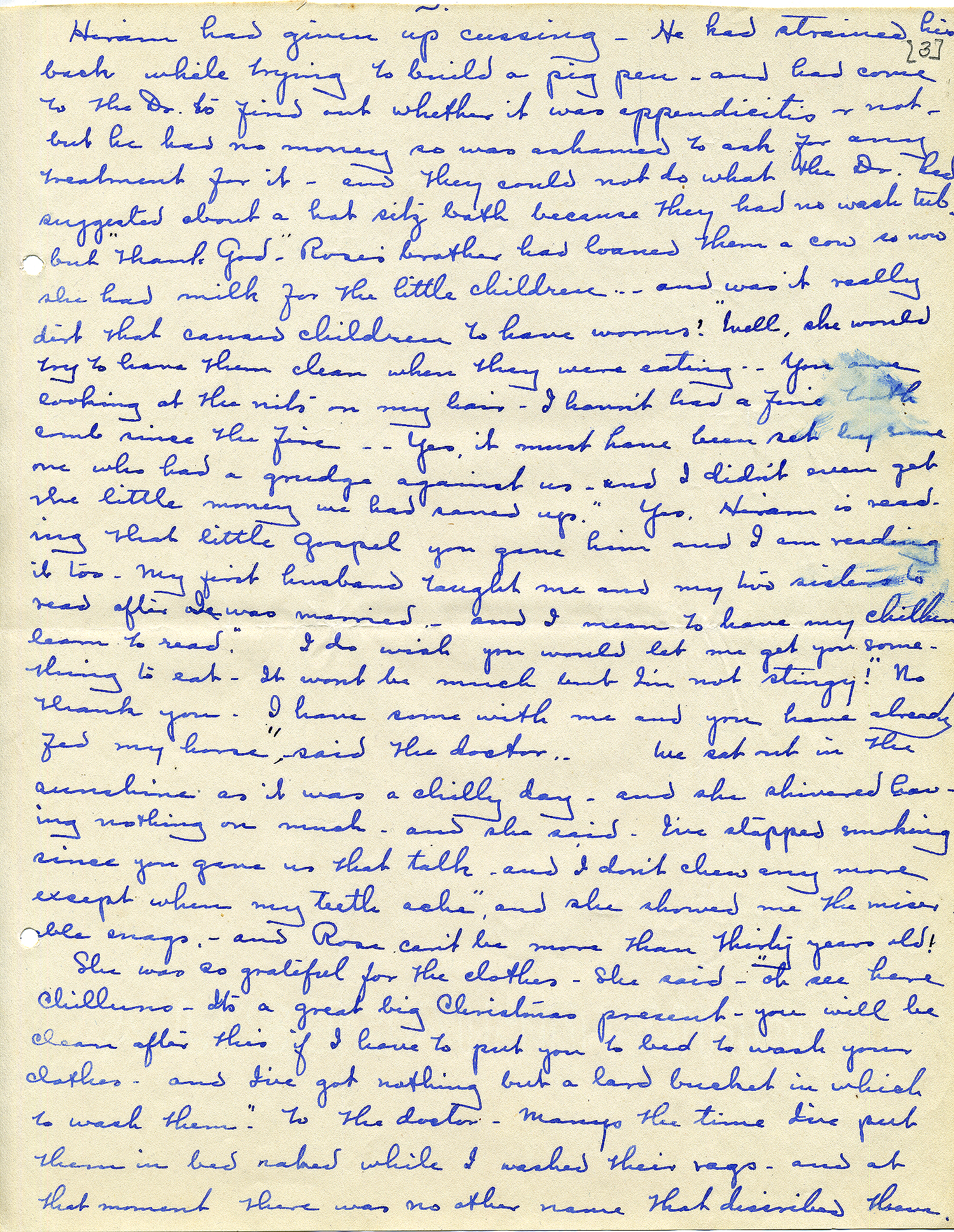 Hiram had been convinced that to save his soul he should be baptised, so she had borrowed clothes for the young’uns and had taken them to some place where such a service was being held, and indeed Hiram had given up cussing. He had strained his back while trying to build a pig pen and had come to the Dr to find out whether it was appendicitis or not, but he had no money so was ashamed to ask for any treatment for it – and they could not do what the Dr had suggested about a hot sitz bath because they had no wash tub, but “Thank God” – Rose’s brother had loaned them a cow so now she had milk for the little children…and was it really dirt that caused children to have worms? Well, she would try to have them clean when they were eating – “You are looking at the nits in my hair – I haven’t had a fine tooth comb since the fire…Yes, it must have been set by someone who had a grudge against us – and I didn’t even get the little money we had saved up.” “Yes, Hiram is reading that little Gospel you gave him and I am reading it too. My first husband taught me and my two sisters to read after I was married – and I mean to have my children learn to read.” “I do wish you would let me get you something to eat. It won’t be much but I’m not stingy!” “No thank you, I have some with me and you have already fed my horse” said the doctor.