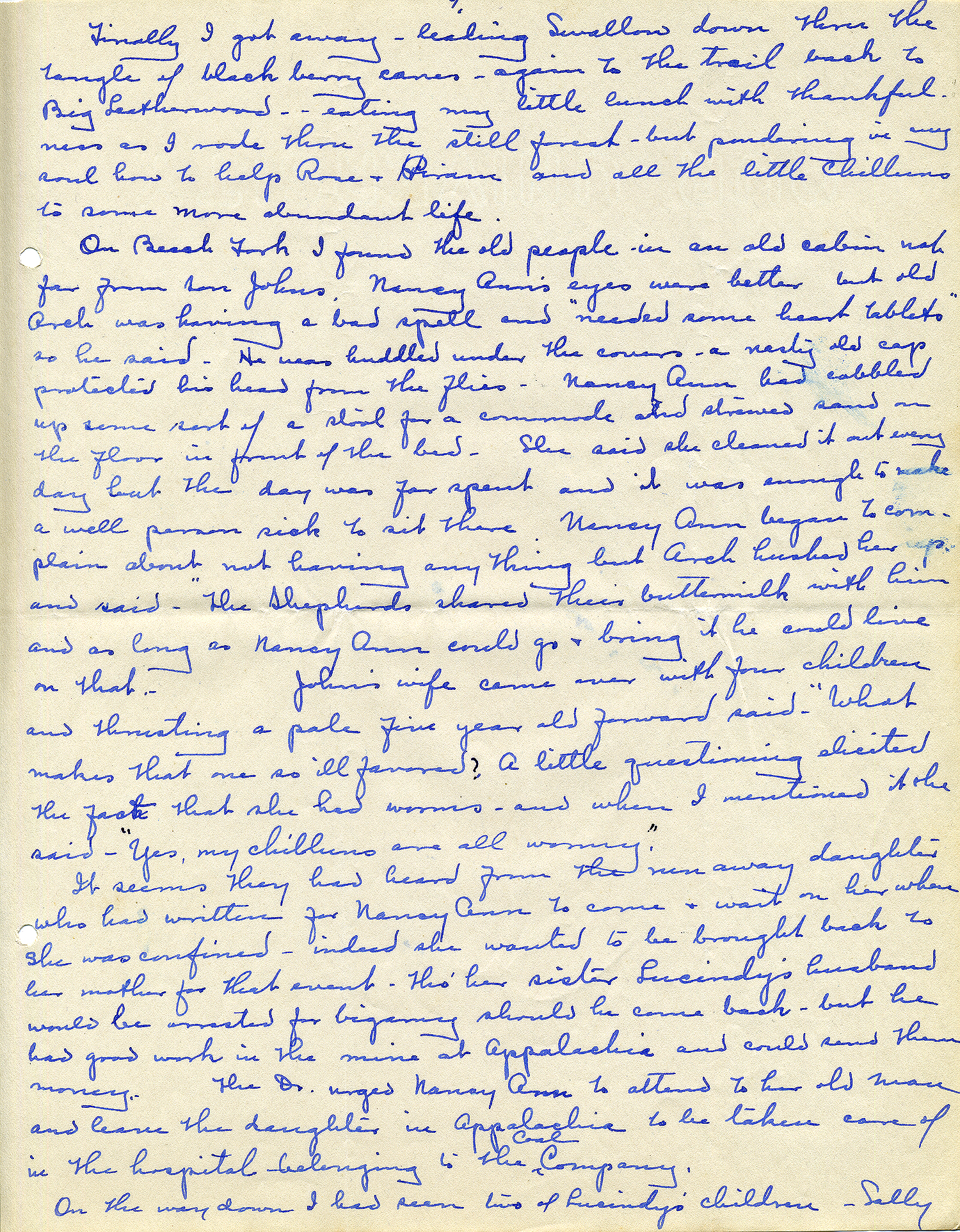 On Beech Fork I found the old people in an old cabin not far from son John’s. Nancy Ann’s eyes were better but old Arch was having a bad spell and “needed some heart tablets” so he said. He was huddled under the covers; a nasty old cap protected his head from the flies. Nancy Ann had cobbled up some sort of a stool for a commode and strewed sand on the floor in front of the bed. She said she cleaned it out every day but the day was far spent and it was enough to make a well person sick to sit there. Nancy Ann began to complain about not having anything but Arch hushed her up and said, the Shepherds shared their buttermilk with him and as long as Nancy Ann could go and bring it he could live on that. John’s wife came over with four children and thrusting a pale five year old forward said, “What makes that one so ill favoured?” A little questioning elicited the fact that she had worms, and when I mentioned it she said, “Yes, my chilluns are all wormy.”