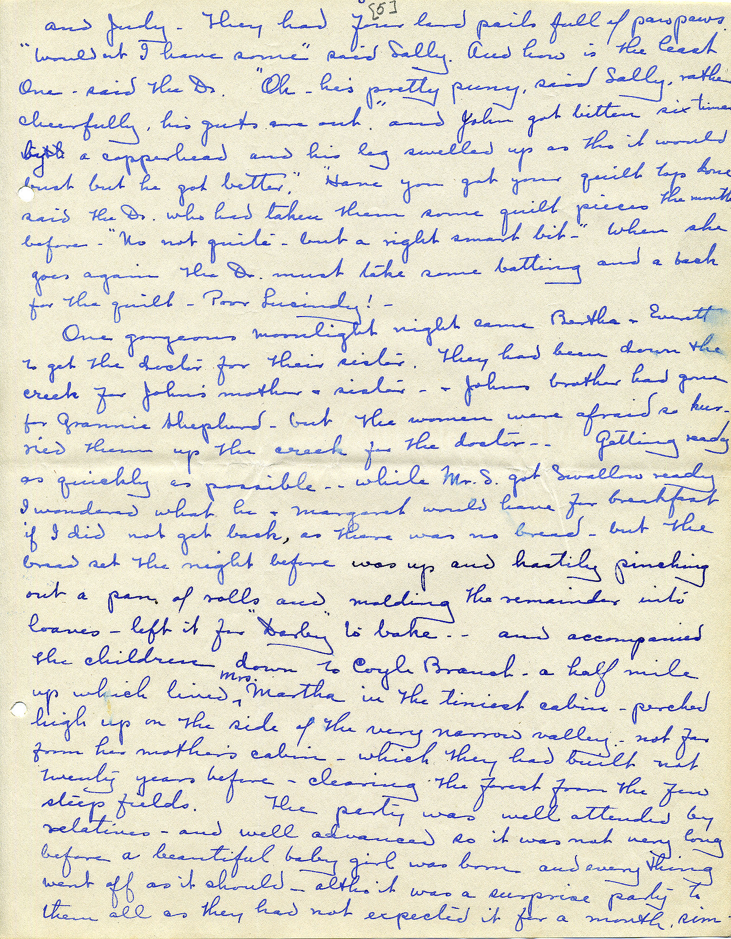 One gorgeous moonlight night came Bertha and Everett to get the doctor for their sister. They had been down the creek for John’s mother and sister, and John’s brother had gone for Grannie Shepherd, but the women were afraid so hurried them up the creek for the doctor. Getting ready as quickly as possible while Mr S got Swallow ready, I wondered what he and Margaret would have for breakfast if I did not get back, as there was no bread. But the bread set out the night before was up and hastily pinching out a pan of rolls and molding the remainder into loaves left it for Darby to bake – and accompanied the children down to Coyle Branch, a half mile up which lived Mrs Martha in the tiniest cabin perched high up on the side of the very narrow valley and not far from her mother’s cabin which they had built not twenty years before, clearing the forest from the few steep fields. The party was well attended by relatives and well advanced so it was not very long before a beautiful baby girl was born and everything went off as it should, although it was a surprise party to them all as they had not expected it for a month. Simply a missed calculation as it was quite normal in every respect. Martha had prepared a change of little garments herself and had the money in reserve to pay the doctor’s fee of $10; the first time this has happened so she was somewhat elated as she returned about 9 o’clock. A breakfast had been served in the tiny lean-to of a kitchen. The usual fried chicken and gravy, fried potatoes and biscuits, and coffee.