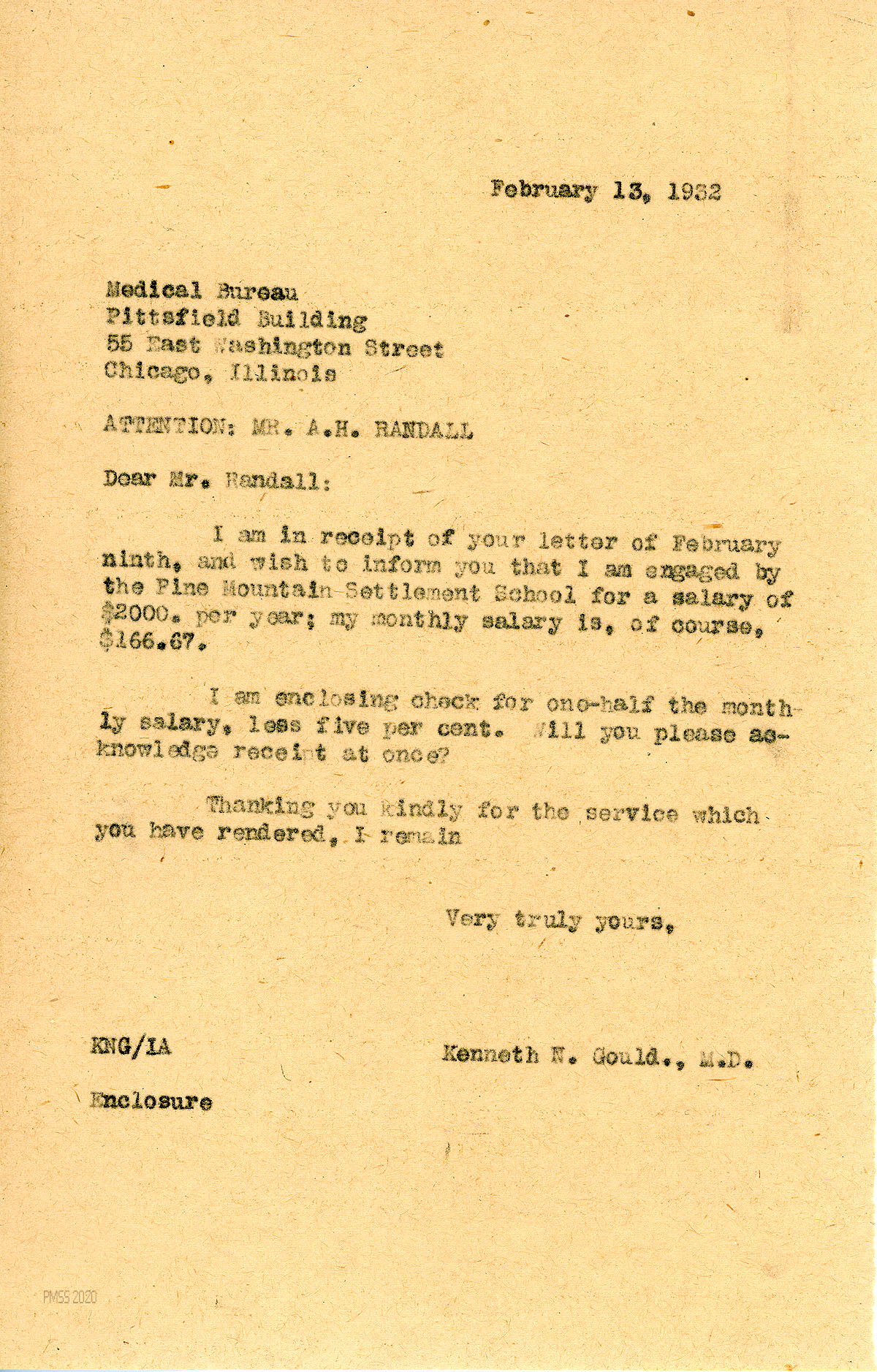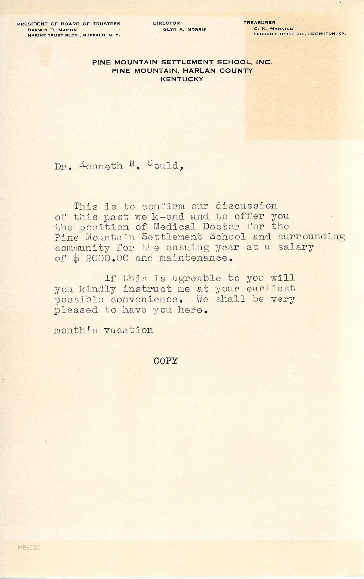 N.D. An unsigned copy of a typewritten note of confirmation to Dr. Kenneth N. Gould on PMSS letterhead, confirming an offer of a “position of Medical Doctor for the Pine Mountain Settlement School and surrounding community for the ensuing year at a salary of $2000.00 and maintenance.” Asks for Gould’s agreement.