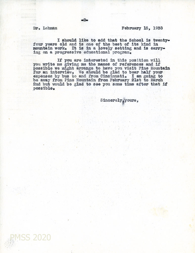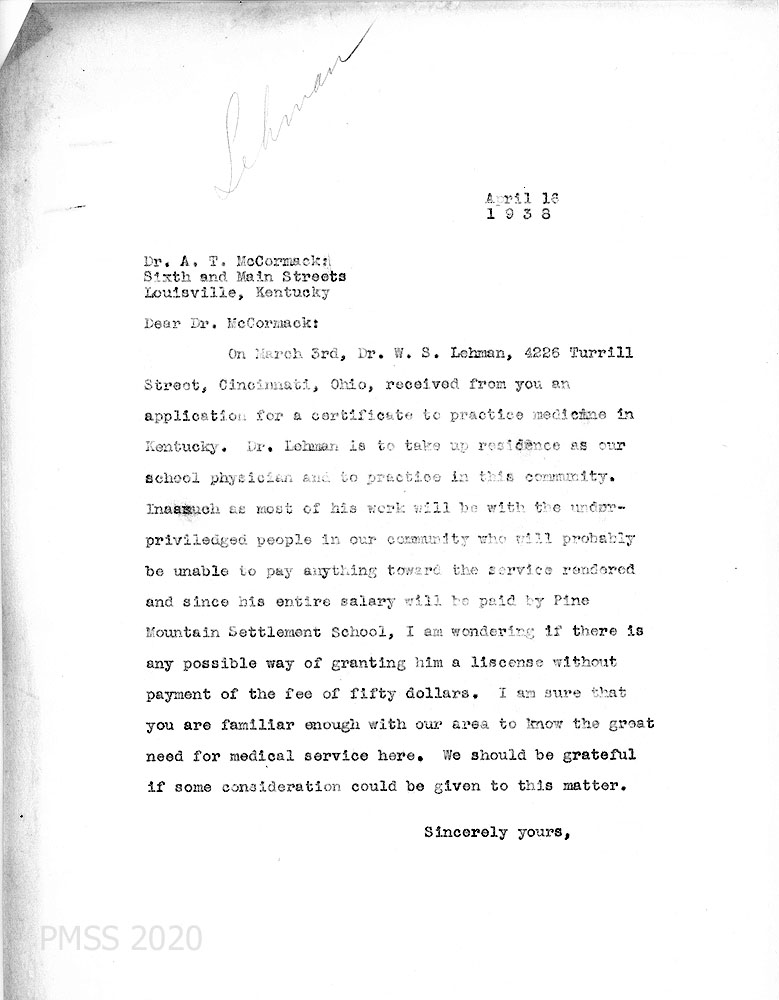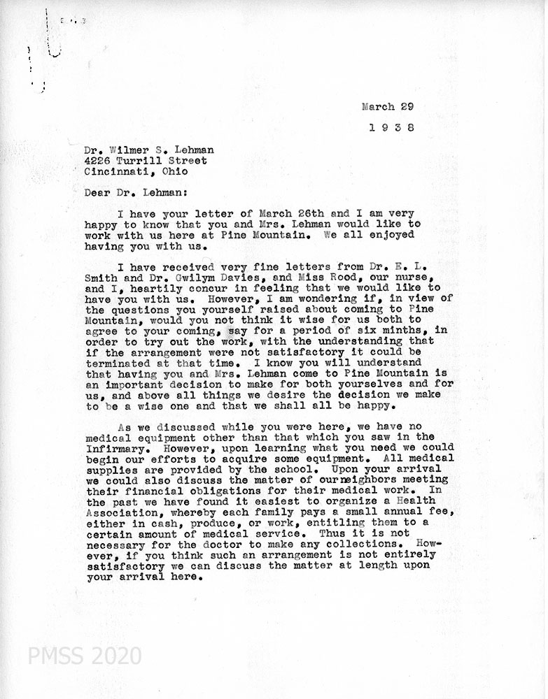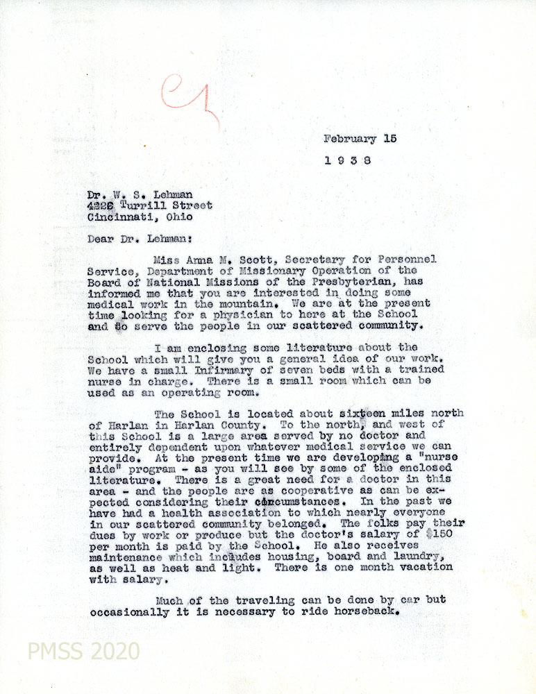 [001] [001a] February 15, 1938. To Dr. W.S. Lehman, Cincinnati, OH, from [unsigned, likely Glyn A. Morris, Director]. [001]. Informed by “Miss Anna M. Scott, Secretary for Personnel Service, Department of Missionary Operation of the Board of National Missions of the Presbyterian” that Lehman is interested in “doing medical work in the mountains,” he tells Lehman that the School is currently looking for a physician for the School and “our scattered community.” Morris encloses literature; describes the Infirmary which has seven beds, a trained nurse in charge and a small operating room. Describes the School’s location; medical service in the surrounding community; “nurse aide” program; former health association; salary of $150 including maintenance (housing, board, laundry, heat and light) and one month vacation with salary; traveling is done by car and occasionally by horseback. [001a] Lehman, if interested, should send names of references and arrange a possible visit.