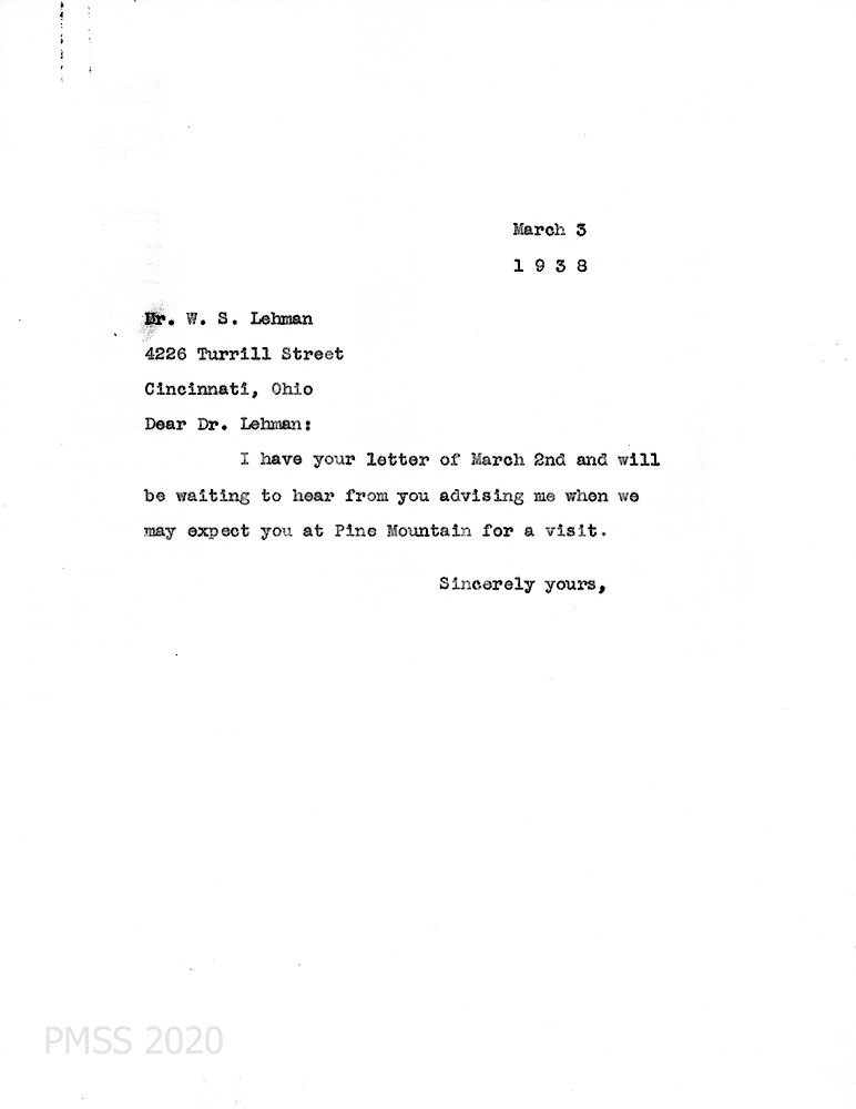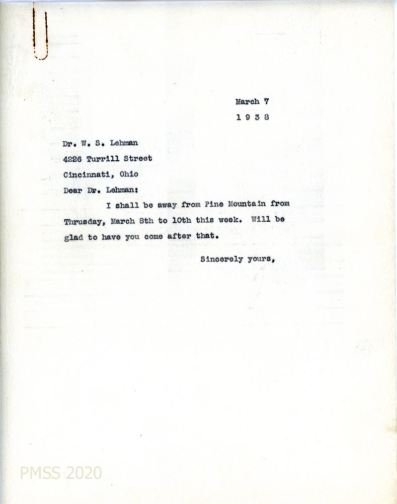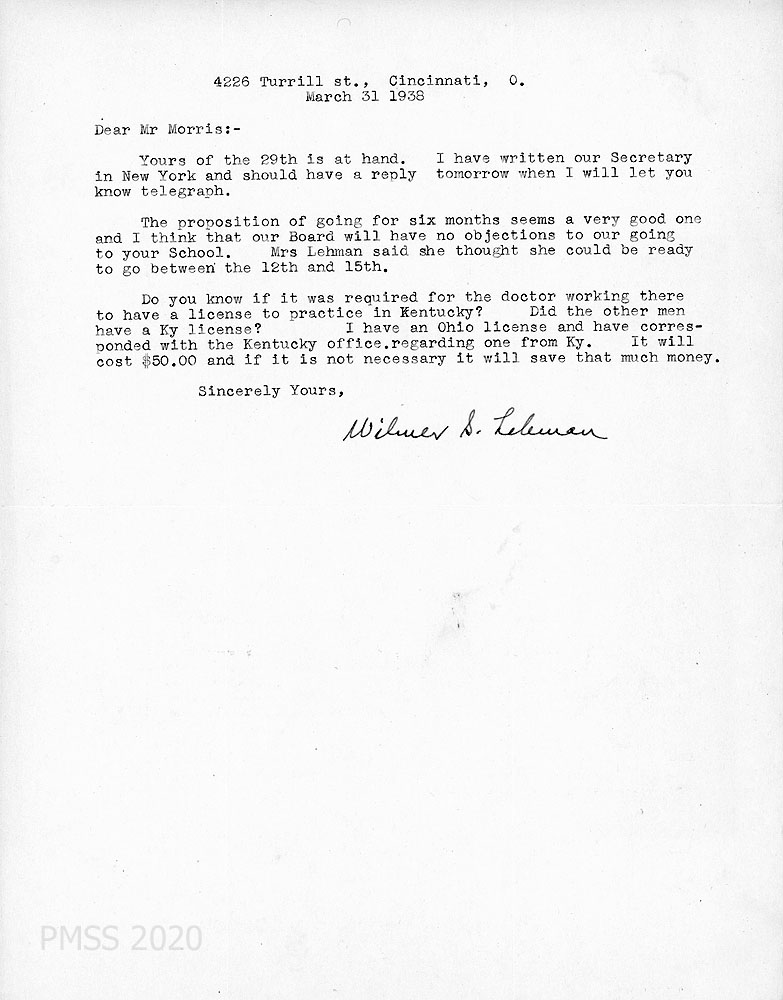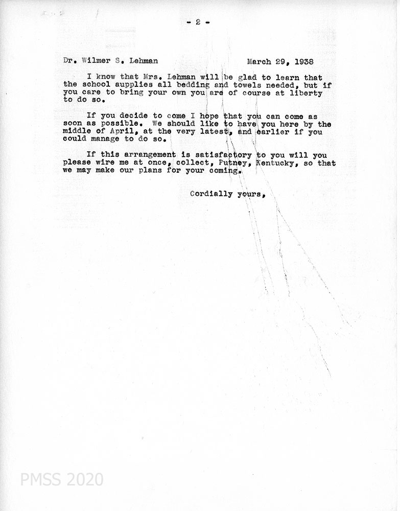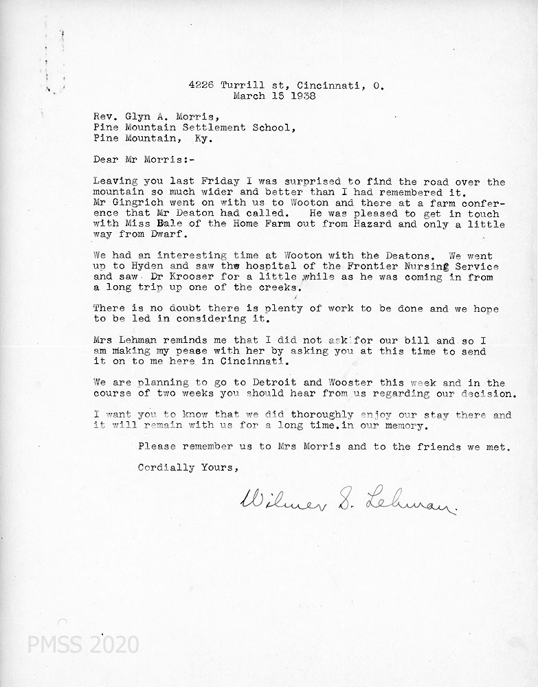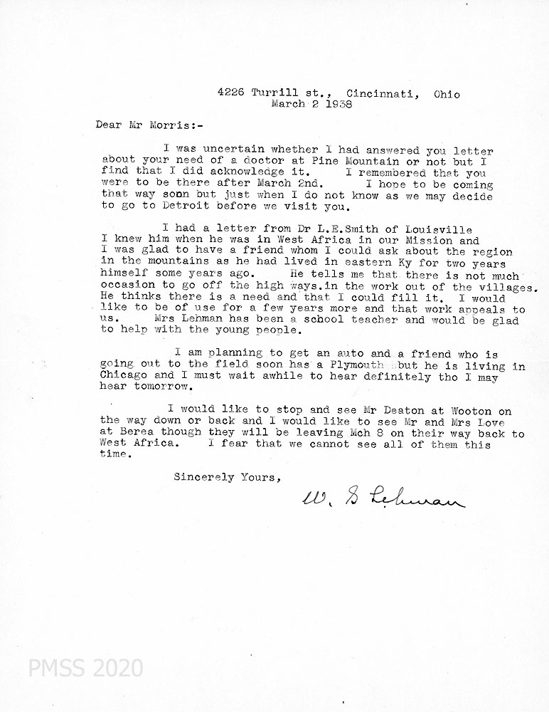 [003] March 2, 1938. Typewritten letter to Morris from Lehman, who plans on visiting PMSS when he gets a car; has consulted with a friend, Dr. L. E. Smith of Louisville who lived in eastern KY. “Mrs. Lehman has been a school teacher and would be glad to help with the young people.” He would like to visit Mr. Deaton at Wooton and Mr. and Mrs. Love at Berea en route to PMSS.