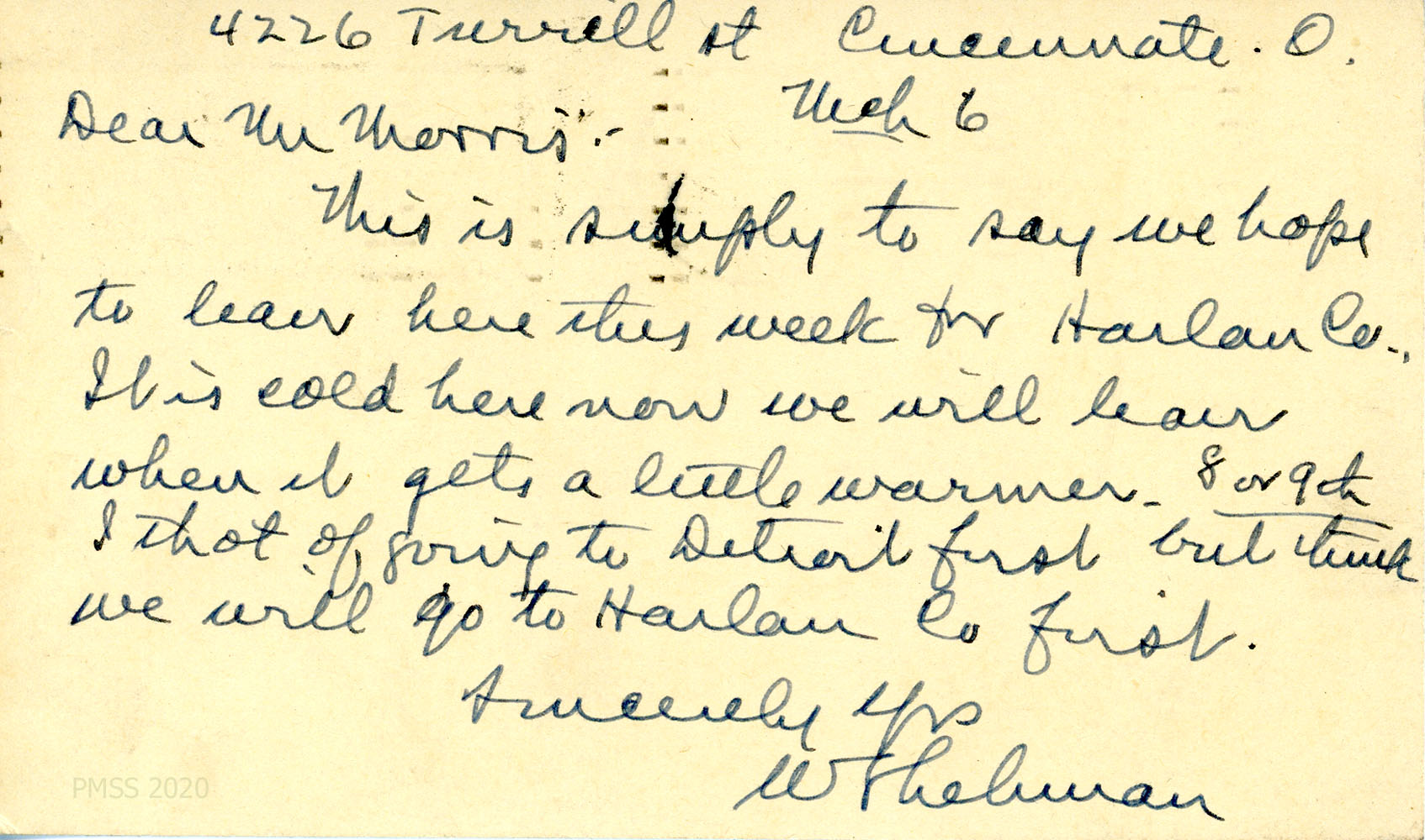 [013] N.D. Handwritten note to Mr. [Arthur W.] Dodd from Lehman in Wooster, OH, who “left Mrs. Lehman at Peewee Valley Sanitarium near Louisville and expect to be there again the 20th and see how it is with her. If it seems wise [I’ll] bring her back to Pine Mountain, otherwise leave her there for three weeks more. It is possible our son Sanford has been there….” He expects to be at PMSS on the 21st or 22nd and will bring a few things for the Infirmary.