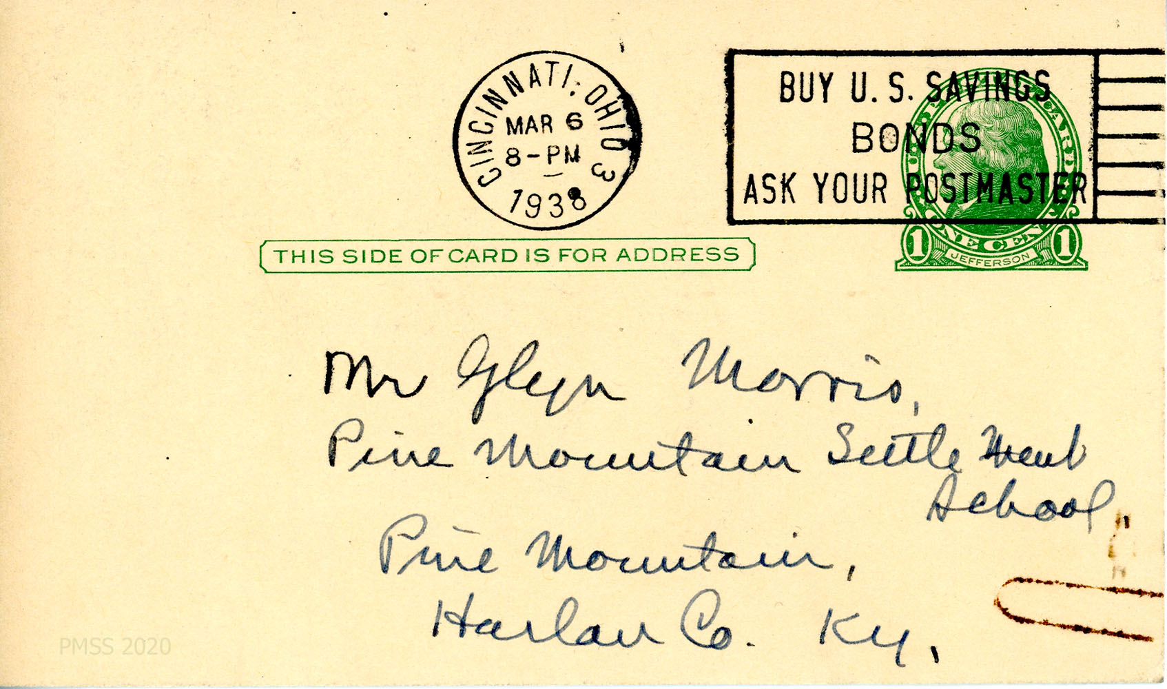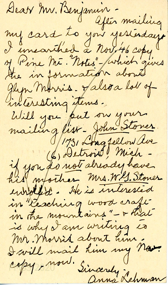 [032] [032a] N.D., apparently February 28, 1947. Handwritten note to Benjamin from Mrs. Lehman, [032] who found her November 1946 copy of Pine Mountain “Notes” with Morris’s information; she asks him to add John Stoner of Detroit, MI, to the PMSS mailing list, who is interested in “teaching woodcraft in the mountains.” [032a] Address side of postcard.