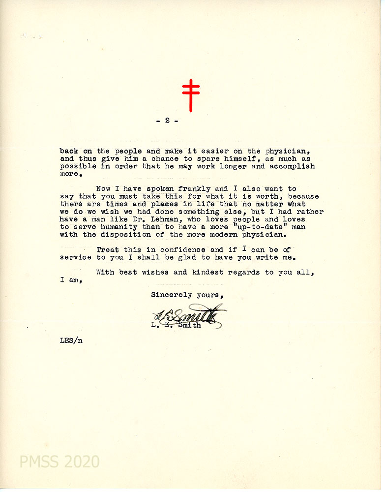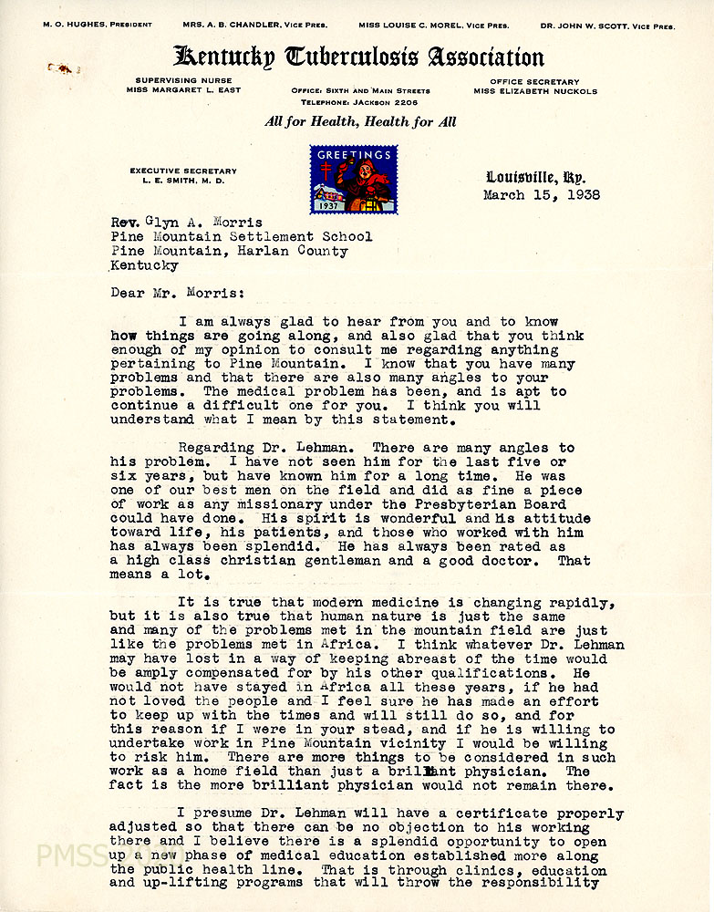 [007] [007a] March 15, 1938. Two-page typewritten letter to Morris from L.E. Smith, M.D., Executive Secretary on letterhead for Kentucky Tuberculosis Association, Louisville, KY. “I am always glad to hear from you…” Writes positively about Dr. Lehman, who he hasn’t seen for the last five or six years, but has known him for a long time. “He was one of our best men on the field and did as fine a piece of work as any missionary under the Presbyterian Board could have done. … many of the problems met in the mountain field are just line the problems met in Africa. … I think whatever Dr. Lehman may have lost in a way of keeping abreast of the time[s] would be amply compensated for by his other qualifications….” Dr. Smith sees an “opportunity to open up a new phase of medical education established more along the public health line. That is through clinics, education and up-lifting programs that will throw the responsibility [007a] back on the people and make it easier on the physician. …I had rather have a man like Dr. Lehman, who loves people and loves to serve humanity than to have a more ‘up-to-date’ man with the disposition of the more modern physician.”