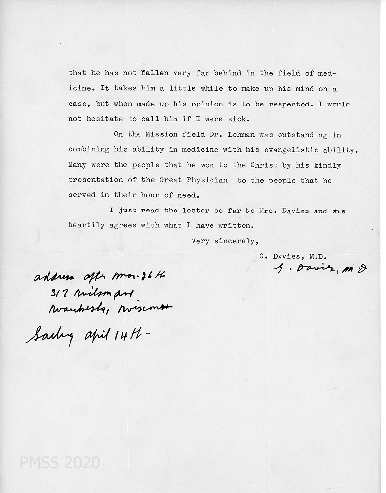 [009] [009a] March 21, 1938. Two-page typewritten letter to Morris from Dr. Gwilym Davies in Waukesla(?), Wisconsin, who has known Lehman for “the past four years and during that time I have come to respect him a great deal as a man and as a doctor.” They have worked together at times on patients. “Dr. Lehman was held in high esteem by the French doctors of Cameroun” and the mission doctors. [009a] Describes how Lehman combined his “ability in medicine with his evangelistic ability.”