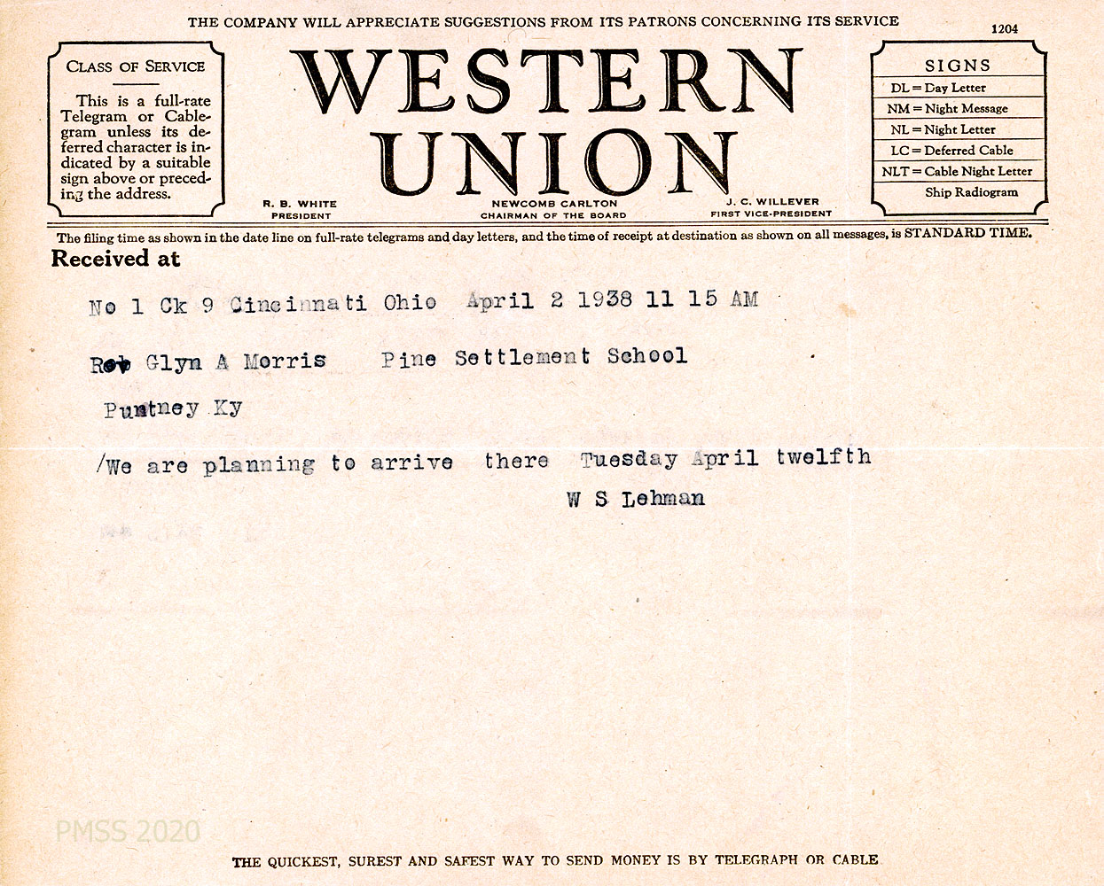 [014] April 2, 1938. Western Union telegram to Morris from W.S. Lehman in Cincinnati, OH, who will arrive at PMSS on April 12th.