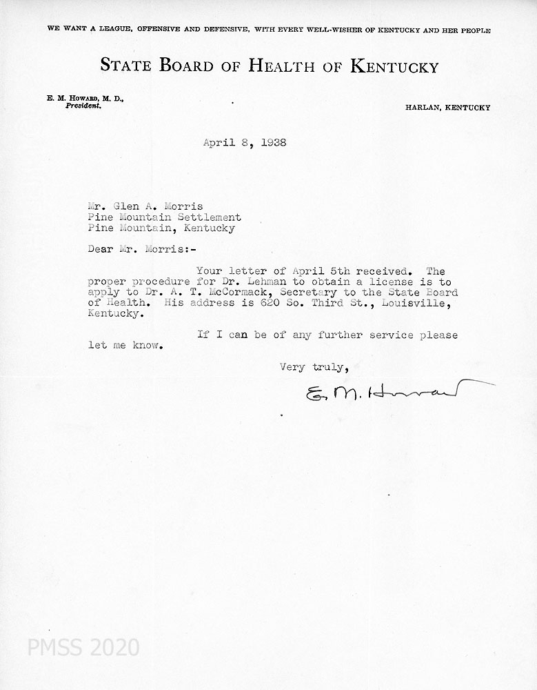 [017] April 8, 1938. Typewritten letter to Morris from E.M. Howard, M.D., President of State Board of Health of Kentucky in Harlan, who advises Morris on the proper procedure for Dr. Lehman to obtain a Kentucky license.