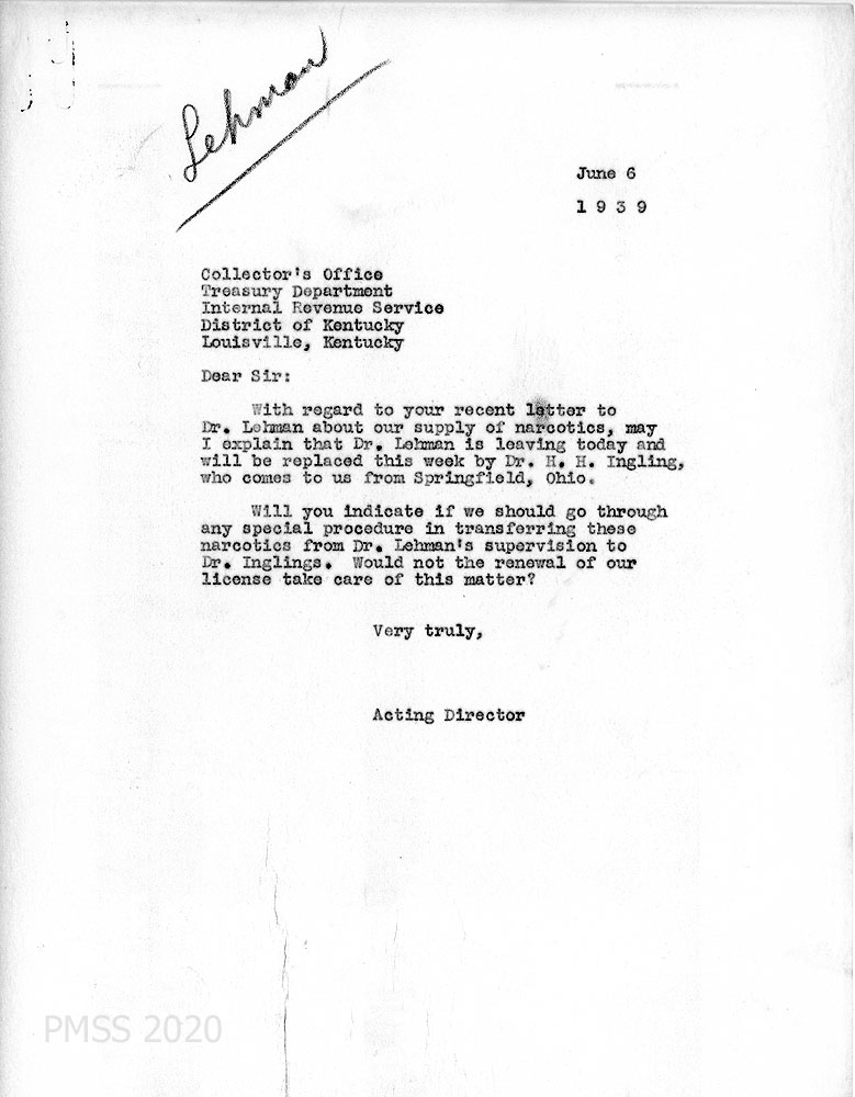 [019] June 6, 1939. To “Sir” in Collector’s Office, Treasury Department, Internal Revenue Service, Louisville, KY from [unsigned, possibly William D. Webb?], Acting Director, who asks if there is a procedure in transferring narcotics to Dr. Howard H. Ingling from Dr. Lehman, who was replacing Lehman.