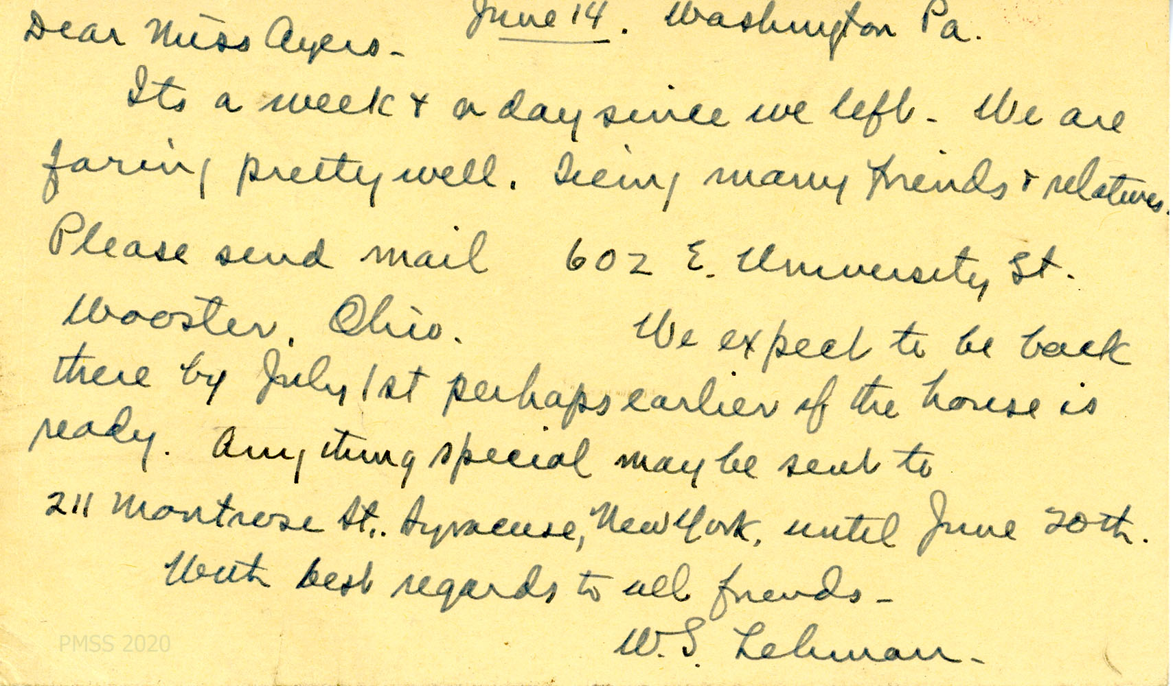 [020] [020a] June 14, [no year]. Handwritten postcard to Miss Joan Ayers, from Lehman in Washington, PA, [020] who provides his forwarding addresses in Syracuse, NY (until June 20), and Wooster, OH. [020a] Address side of the postcard.