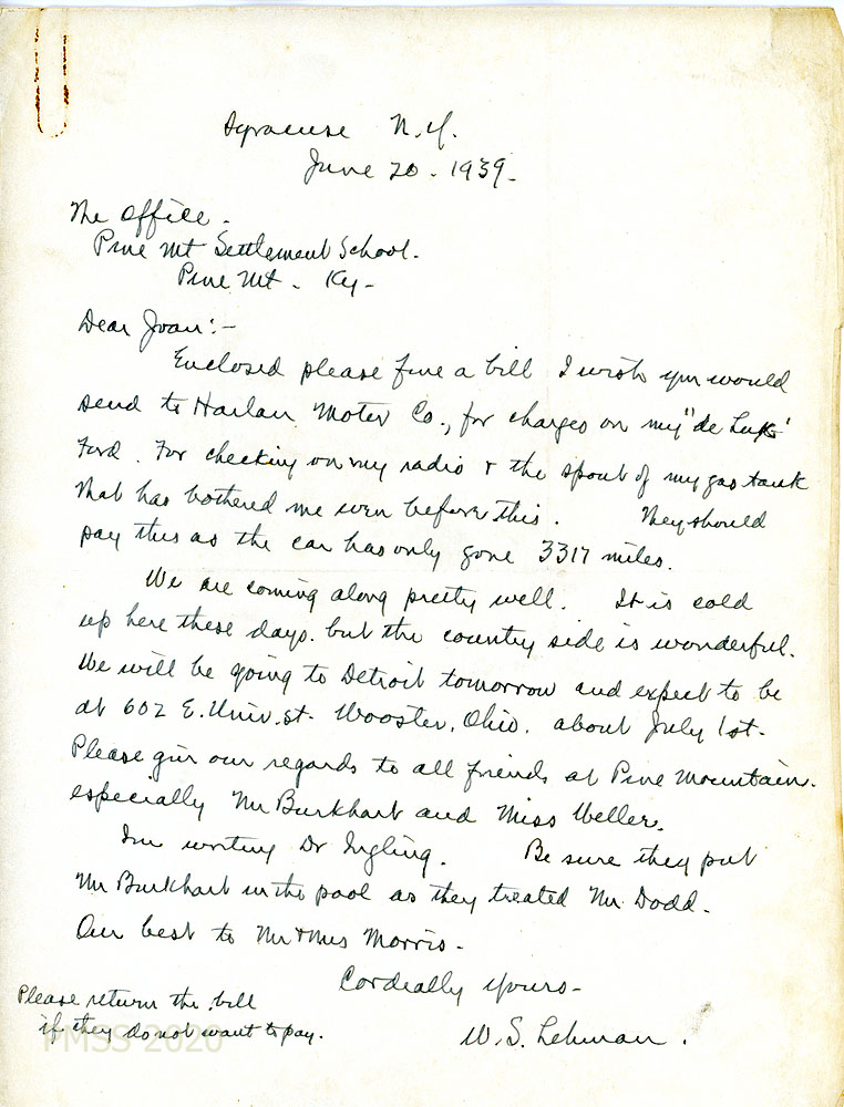 [023] June 25, 1939. To “Gentlemen” at the Harlan Motor Company from [unsigned, likely Ayers], Acting Business Manager, who encloses a bill from a Ford dealer in Syracuse, NY, and asks that payment is sent to Lehman.