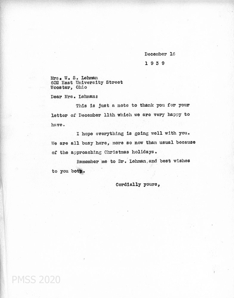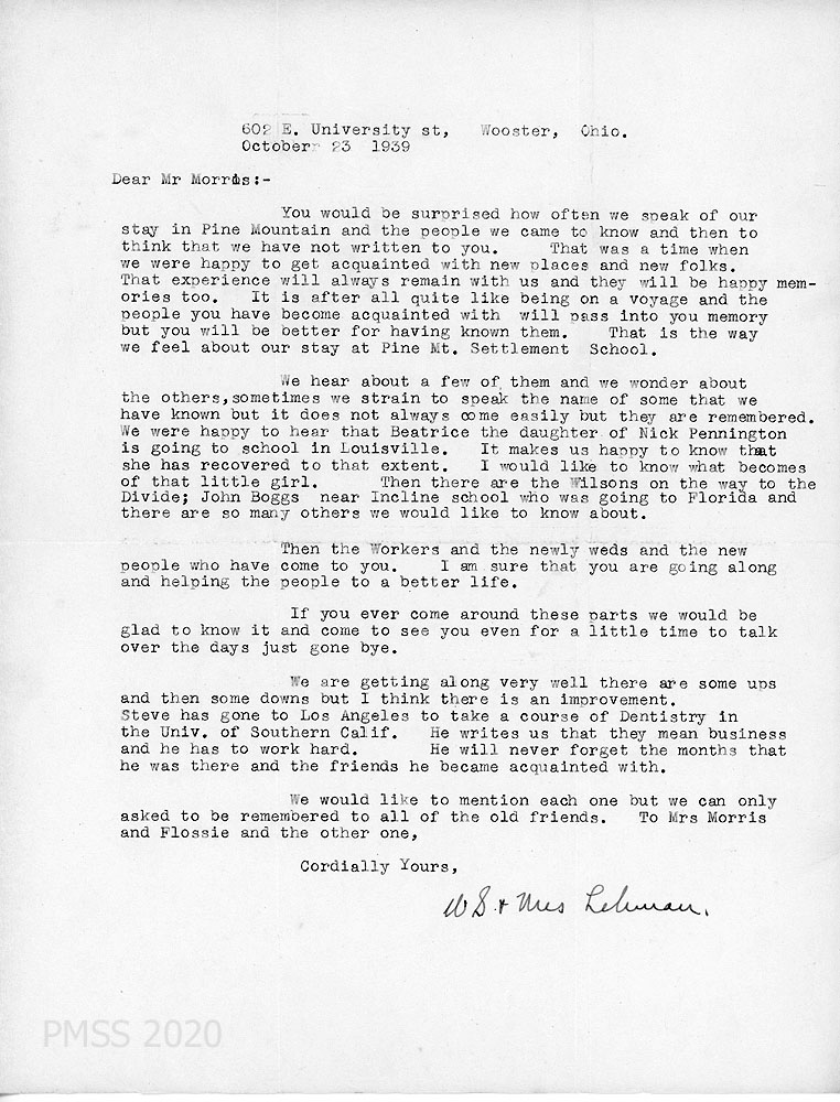 [025] October 23, 1939. Typewritten letter to Morris from Lehman in Wooster, OH, who describes his and his wife’s feelings about their stay at PMSS and who they miss, such as Nick Pennington and his daughter, Beatrice, the Wilsons and John Boggs. Steve (his son?) is studying dentistry at Univ. of S. California and will always remember the months he was at PMSS.