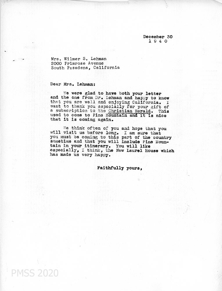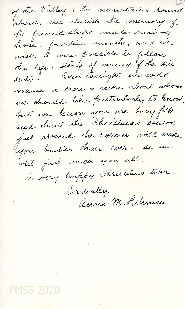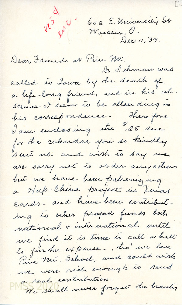 [026] [027] December 11, 1939. Handwritten two-page letter to “Friends at Pine Mt.” from Anna M. Lehman in Wooster, OH, [026] who encloses 25 cents for the calendar. “We shall never forget the beauty [027] of the Valley & the mountains ‘round about. We cherish the memory of the friendships made during those fourteen months and we wish it were possible to follow the life-story of many of the students.”