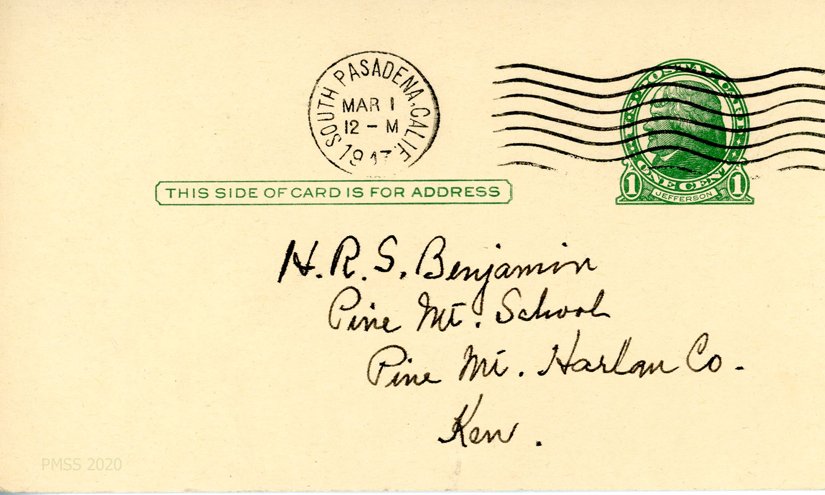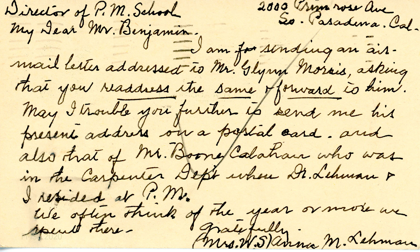 [031] [031a] February 27, 1947. Handwritten postcard to H.R.S. Benjamin, Director, from Mrs. Lehman, [031] who asks him to forward her letter to Morris and asks for present addresses of Morris and Boone Callahan. [031a] Address side of postcard.