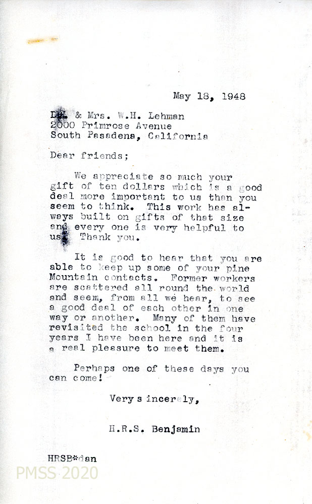 [033] May 18, 1948. To Dr. & Mrs. W.H. Lehman in S. Pasadena, CA, from H.R.S. Benjamin, thanking them for their gift.