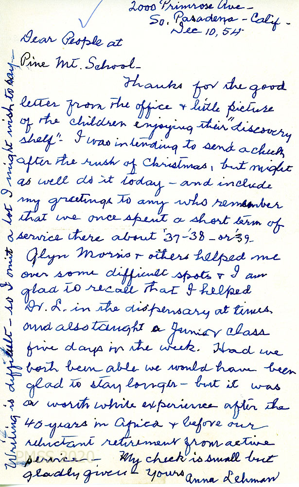 [035] December 10, 1954. Handwritten letter to “People at Pine Mt. School” from Anna Lehman, thanking them for the letter from the Office. She encloses a check and writes about their time at PMSS: “Glyn Morris and others helped me over some difficult spots & I am glad to recall that I helped Dr. L. in the dispensary at times and also taught a Junior class five days in the week. Had we both been able we would have been glad to stay longer — but it was a worthwhile experience after the 40 years in Africa and before our reluctant retirement from active service.”
