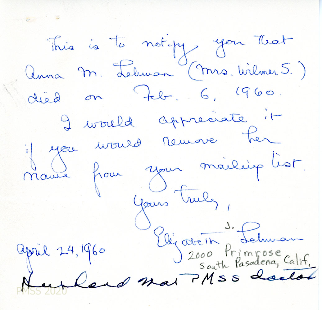 [036] April 24, 1960. [No salutation] from Elizabeth J. Lehman in South Pasadena, CA, who reports that “Anna M. Lehman (Mrs. Wilmer S.) died on Feb. 6, 1960,” and asks that her name be removed from the PMSS mailing list. (Notation in different handwriting: “Husband was PMSS doctor.”)