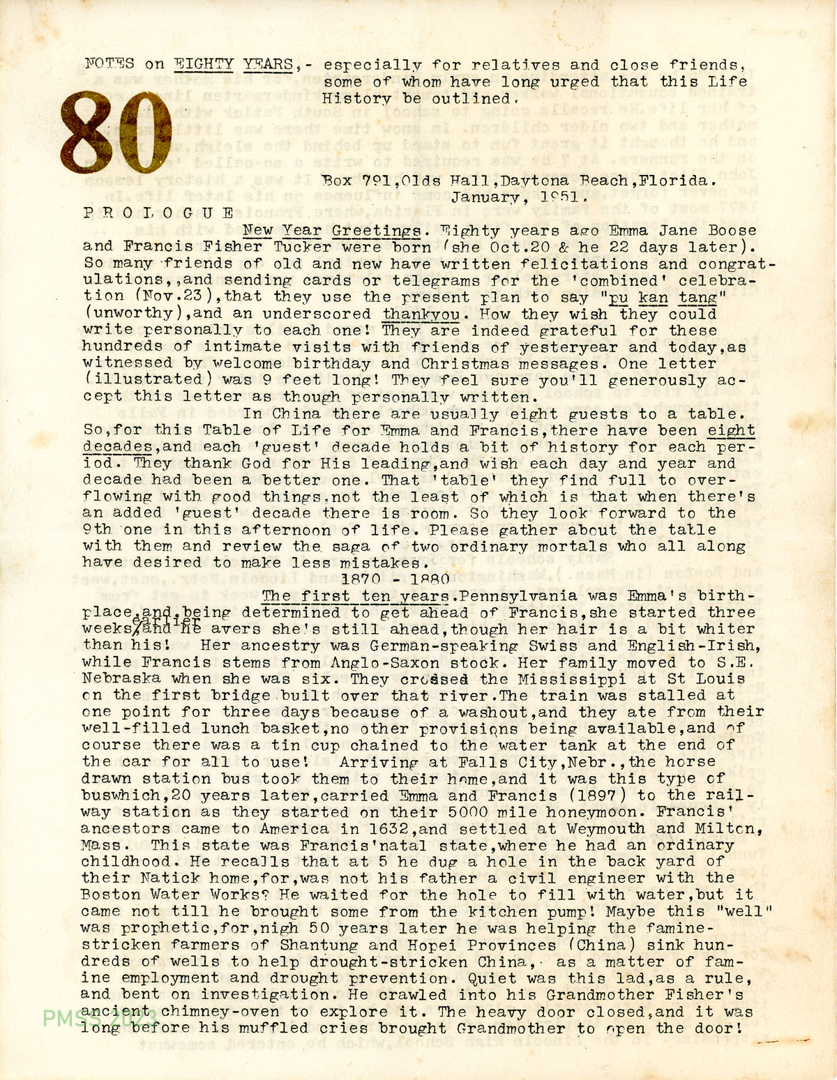 New Year Greetings. Eighty years ago Emma Jane Boose and Francis Fisher Tucker were born (she Oct. 20 & he 22 days later). So many friends of old and new have written felicitations and congratulations, and sending cards or telegrams for the ‘combined’ celebration (Nov. 23), that they use the present plan to say “pu kan tang” (unworthy), and an underscored thankyou. How they wish they could write personally to each one! They are indeed grateful for these hundreds of intimate visits with friends of yesteryear and today, as witnessed by welcome birthday and Christmas messages. One letter (illustrated) was 9 feet long! They feel sure you’ll generously accept this letter as though personally written.