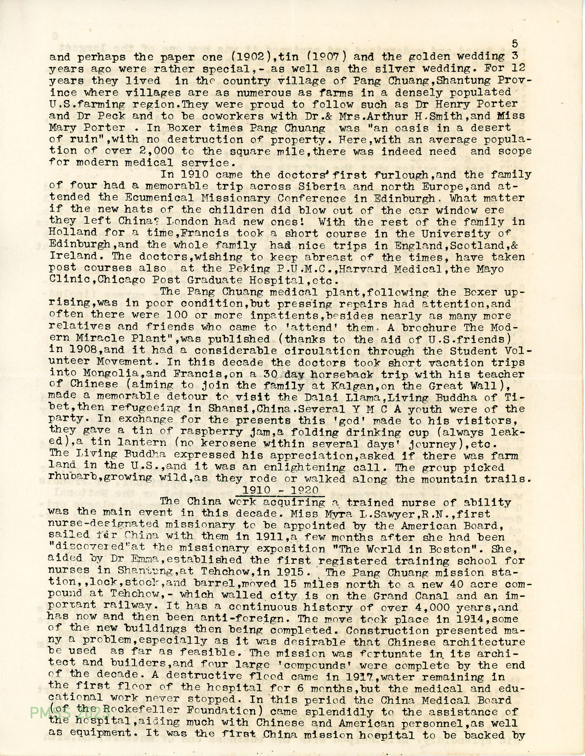 and perhaps the paper one (1902), tin (1907), and the golden wedding 3 years ago were rather special, as well as the silver wedding. For 12 years they lived in the country village of Pang Chuang, Shantung Province, where villages are as numerous as farms in a densely populated U.S. farming region. They were proud to follow such as Dr. Henry Porter and Dr. Peck and to be coworkers with Dr. & Mrs. Arthur H. Smith, and Miss Mary Porter. In Boxer times Pang Chuang was “an oasis in a desert of ruin”, with no destruction of property. Here, with an average population of over 2,000 to the square mile, there was indeed need for modern medical service.