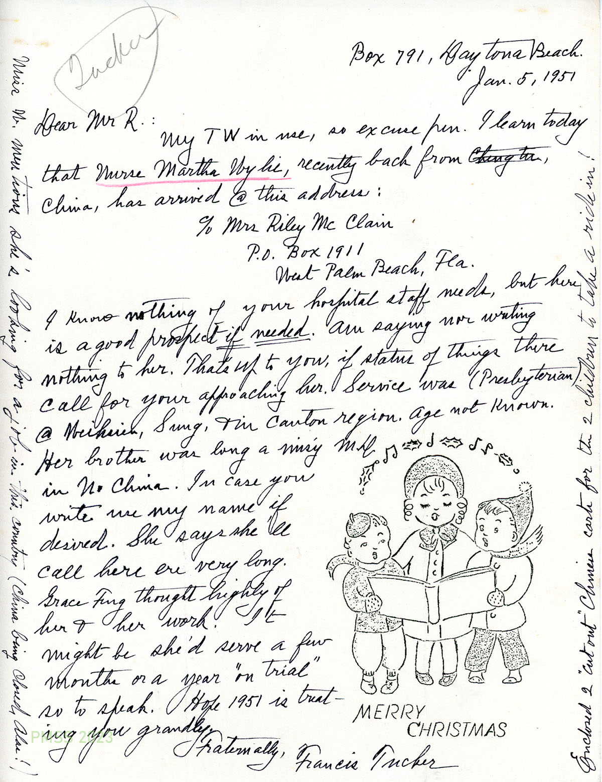 01 January 5. Handwritten letter to “Mr. R.” [PMSS Director, Burton Rogers] from Dr. F.F. Tucker in Daytona Beach, FL, suggesting another possible hire for PMSS: Nurse Martha Wylie[?] in West Palm Beach, FL, recently back from China.