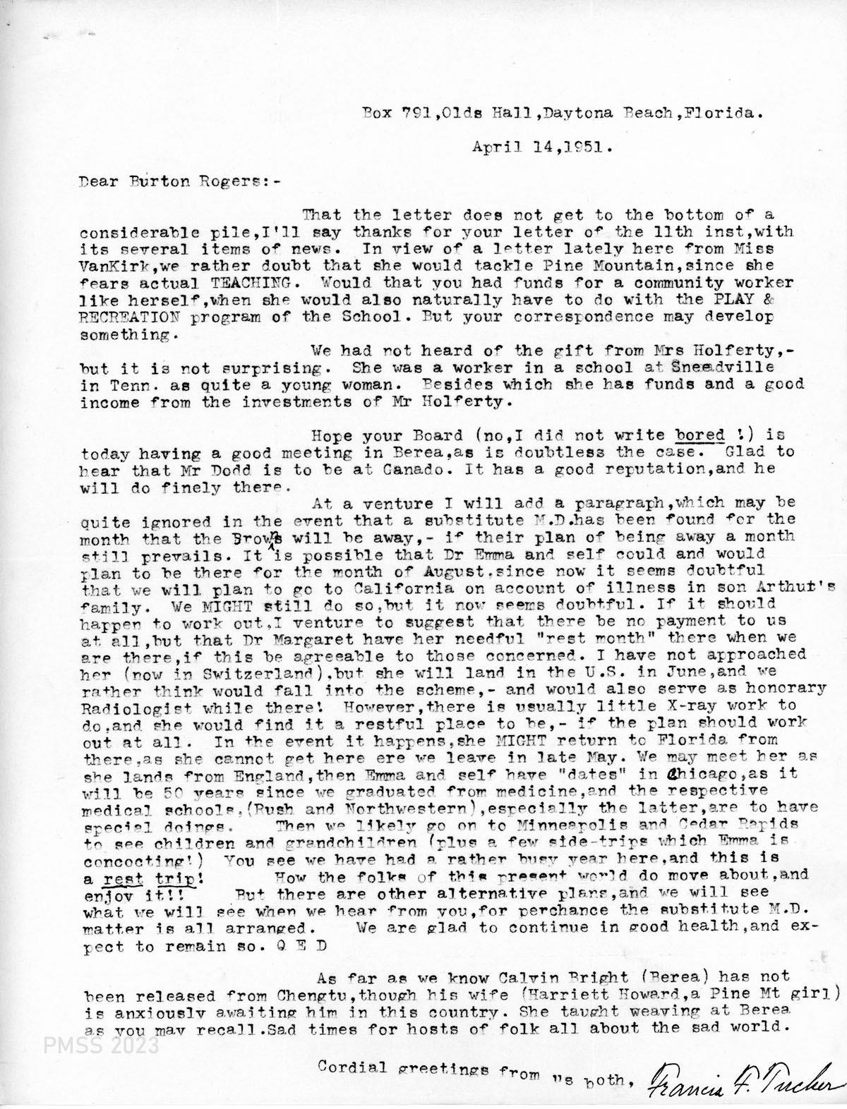 08 April 14. To Rogers from Dr. F.F. Tucker, stating that Miss VanKirk may not be appropriate for PMSS since she would rather serve as a community worker and with plays and recreation than as a teacher. He sends more information about Mrs. Holferty; offers to fill in for Dr. Brown in August, possibly bringing his daughter Margaret; describes their various travel plans. Calvin Bright of Berea “has not been released from Chengtu, though his wife (Harriett Howard, a Pine Mt. girl) is anxiously awaiting him in this country. She taught weaving at Berea…. Sad times for hosts of folk all about the sad world.”