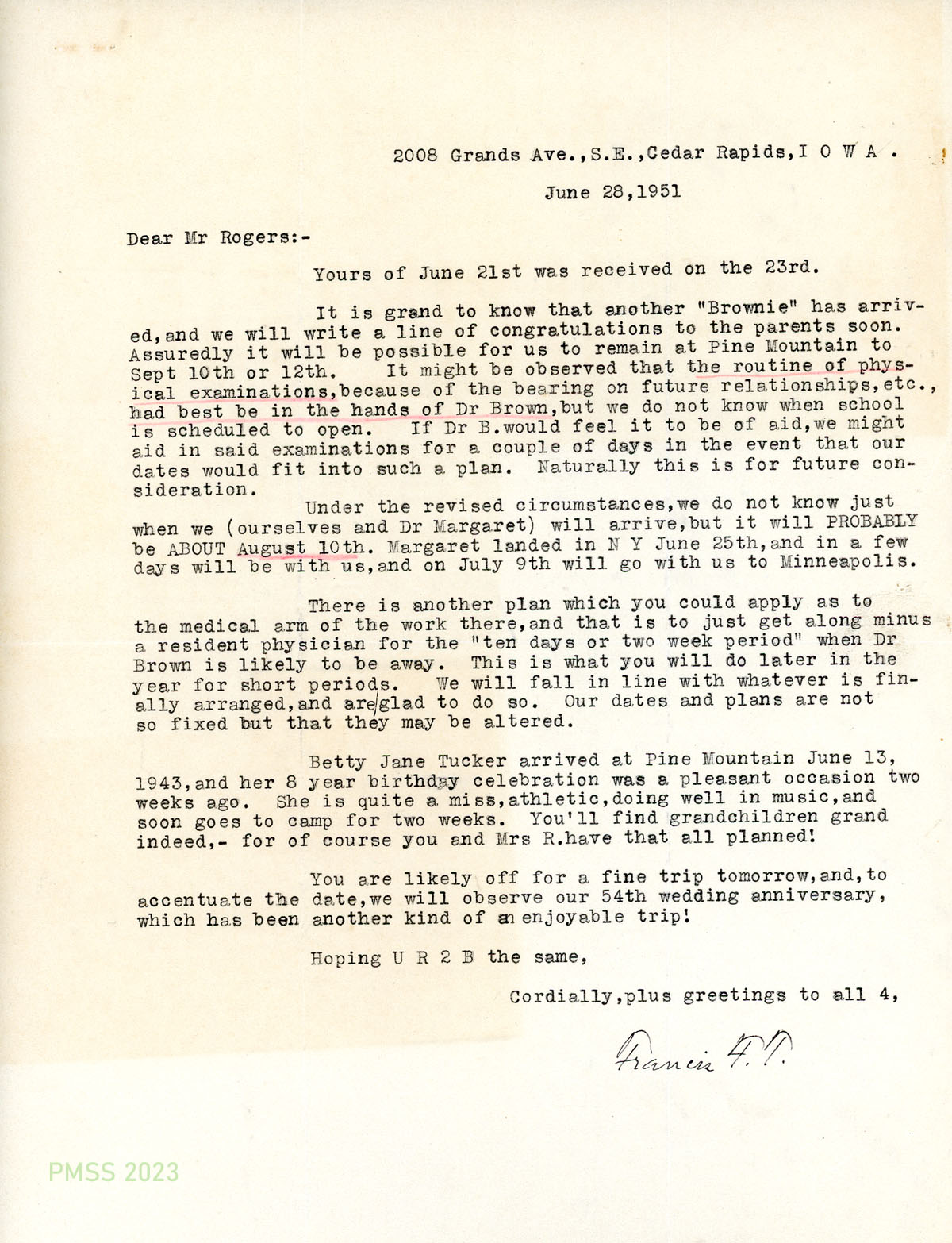 017 June 28. To Rogers from Dr. F.F. Tucker, assuring Rogers that they can stay at PMSS until September 10 or 12. The Tuckers’ grandchild, Betty Jane Tucker, who arrived at PMSS on June 13, 1943, is now 8 years old.