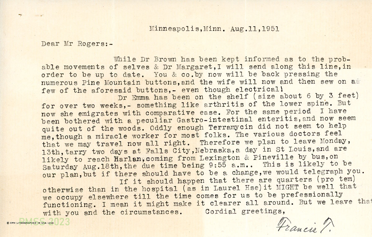 021 August 11. Letter on notecard to Rogers from Dr. F.F. Tucker in Minneapolis, MN, with his son and family. He tells of the medical issues that he and Dr. Emma were experiencing, but both can travel now. He provides their travel plans, arriving in Harlan on August 18. Suggests where they should stay at PMSS.