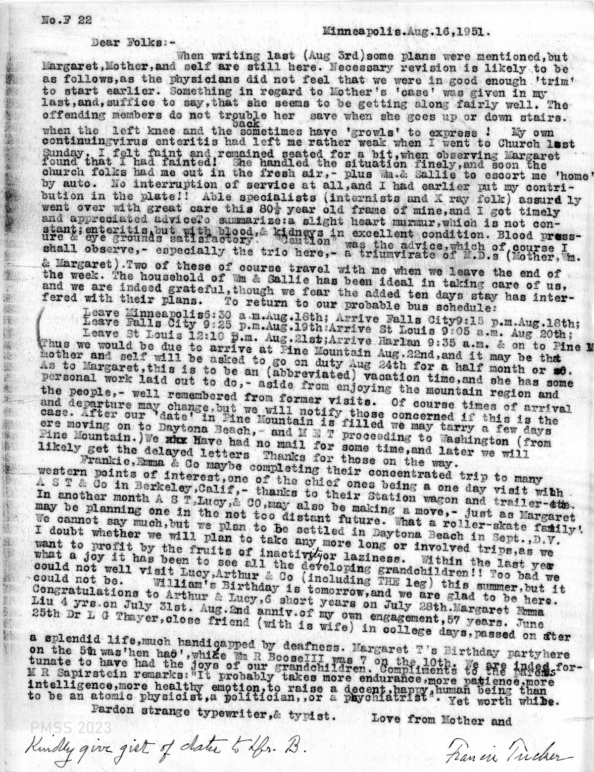 023 August 16. To “Dear Folks” from Dr. F.F. Tucker, explaining a delay in their plans as they have not recovered sufficiently from their illnesses. He provides their bus schedule from Minneapolis to Harlan, arriving August 22; updates on his extended family and friends.
