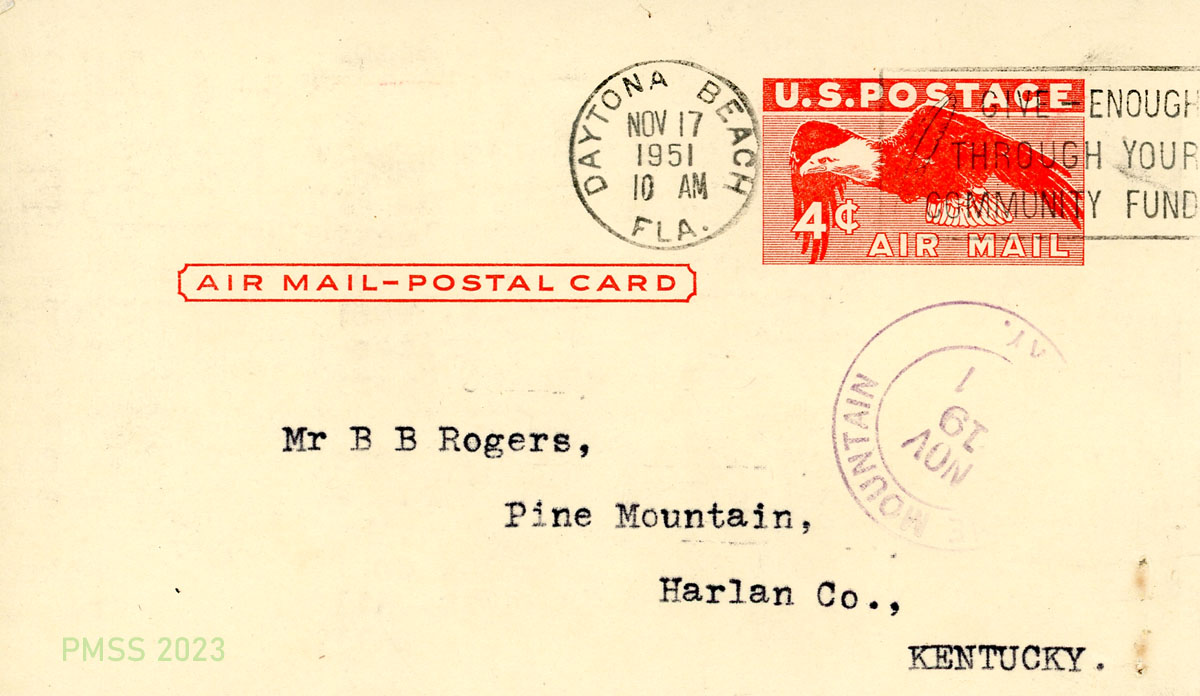 029 November 17 (Daytona Beach, FL) and November 19 (Pine Mountain, KY) [date stamps]. Address side of an air mail postcard to Mr. B.B. Rogers.