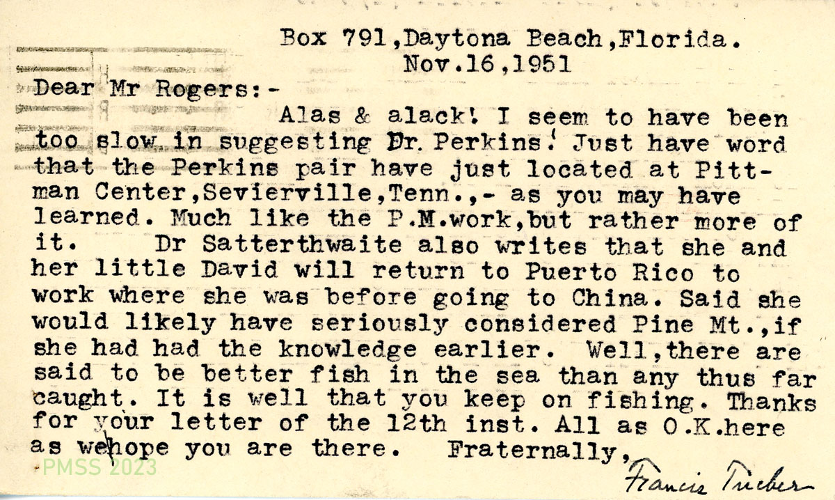 029a November 16, 1951. Message side of postcard to Rogers from Dr. F.F. Tucker, suggesting Dr. Perkins as a possible candidate for PMSS medical work. Mentions Dr. Satterthwaite, who expressed interest in Pine Mountain, but has already moved to Puerto Rico from China.