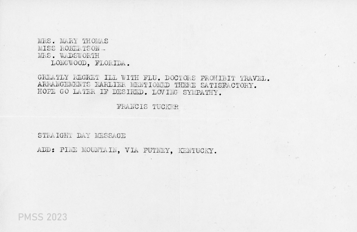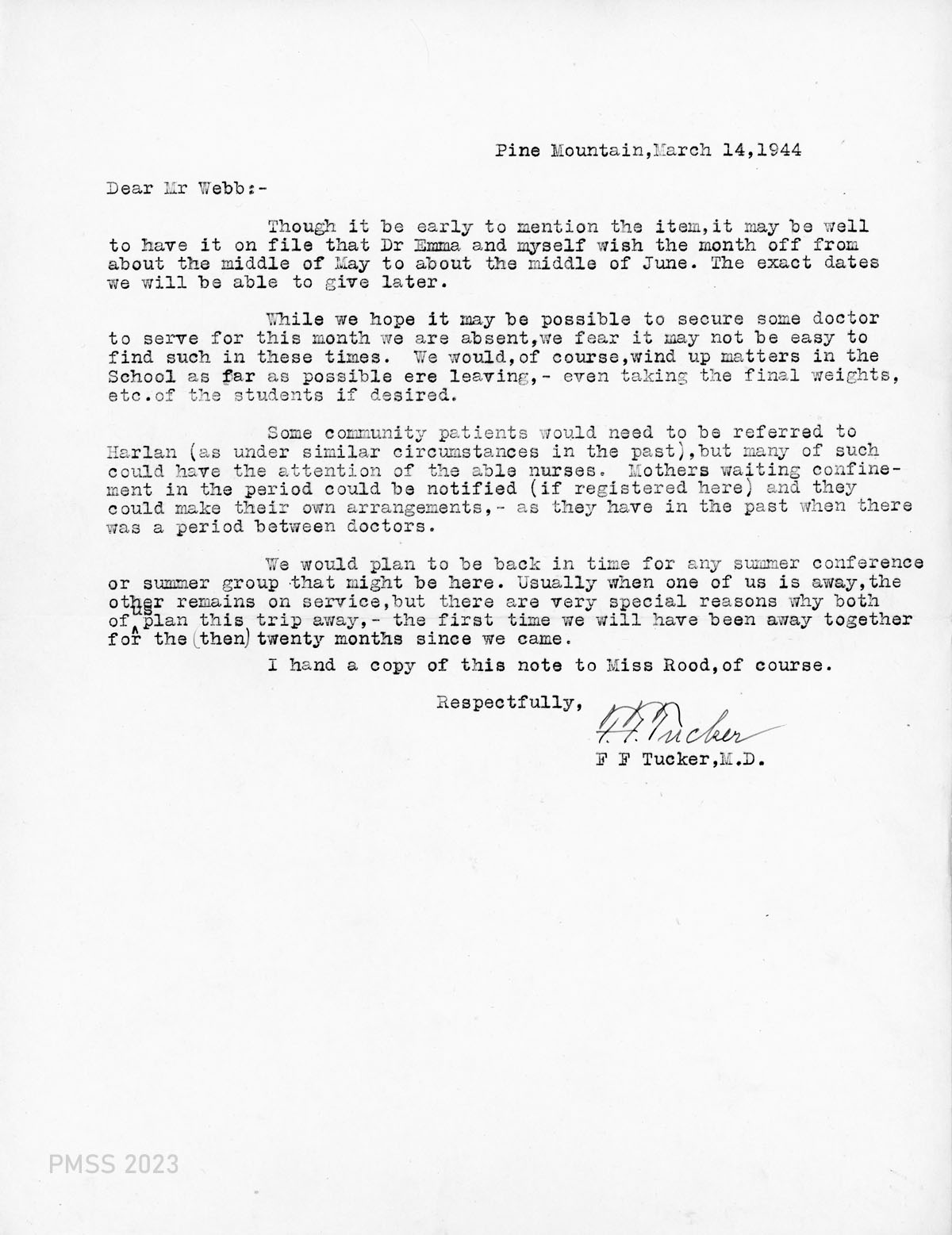 01 [n.d.] Telegram to Mrs. Mary Thomas, Miss Robertson, Mrs. Wadsworth. Dr. Francis ill with flu. Travel is prohibited. Will go later. 02 March 14 to PMSS. Tuckers request the month off (middle of May to middle of June) from duties at PMSS. Requests referral of patients to Harlan during time off for complicated cases and others can rely on the nurse (Grace Rood). Requests that notification of mothers expecting to bear children during time off will be notified. Will be first vacation in 20 months since coming to PMSS for the Tuckers.