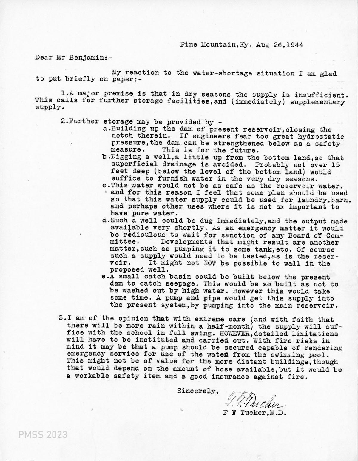 03 August 26, Drs. Tucker to Director H.R.S. Benjamin. Response to the water-shortage situation at PMSS. Three recommendations for the dilemma. # 3 Dr. Francis believes there is sufficient reserve to go forward if water is limited and emergency water is pulled from the swimming pool … good insurance against fire.