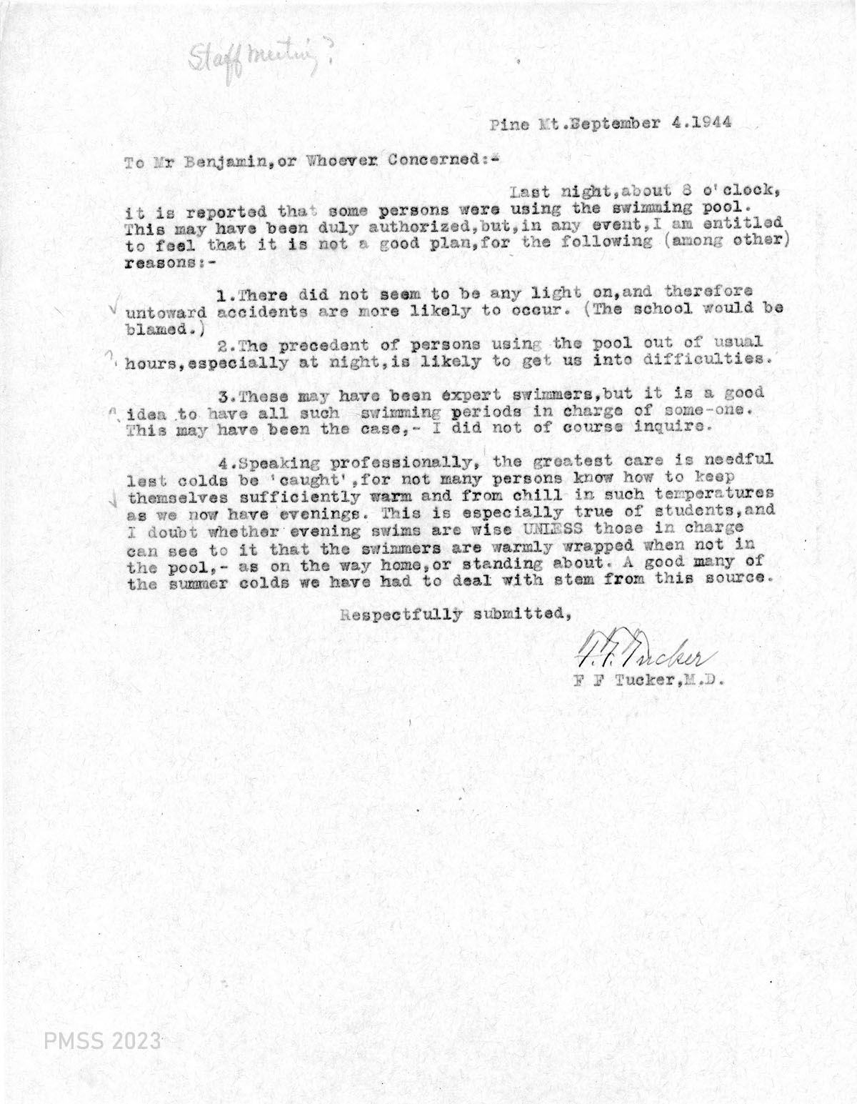 04 September 4. Drs. Tucker to Director H.R.S. Benjamin regarding unsupervised use of the swimming pool that could make the School liable. The doctors also advised the growing possibility of “catching colds” in the cool evenings if swimming is allowed.