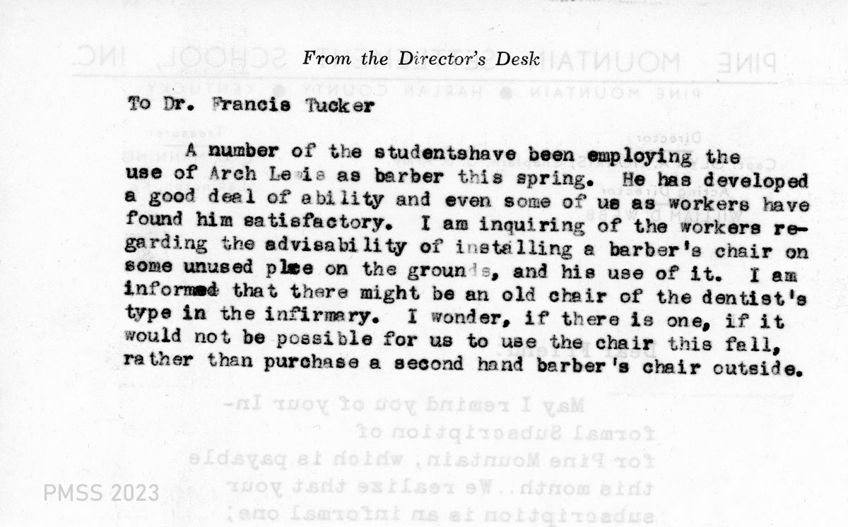 TAGS: Dr. Emma Tucker, Dr. Francis Tucker, PMSS physicians, medical missionary work in China, rural medicine, Arch Lewis, barbers, haircuts, re-purposing dentist chairs, internal administrative correspondence, Pine Mountain Settlement School, Harlan Kentucky