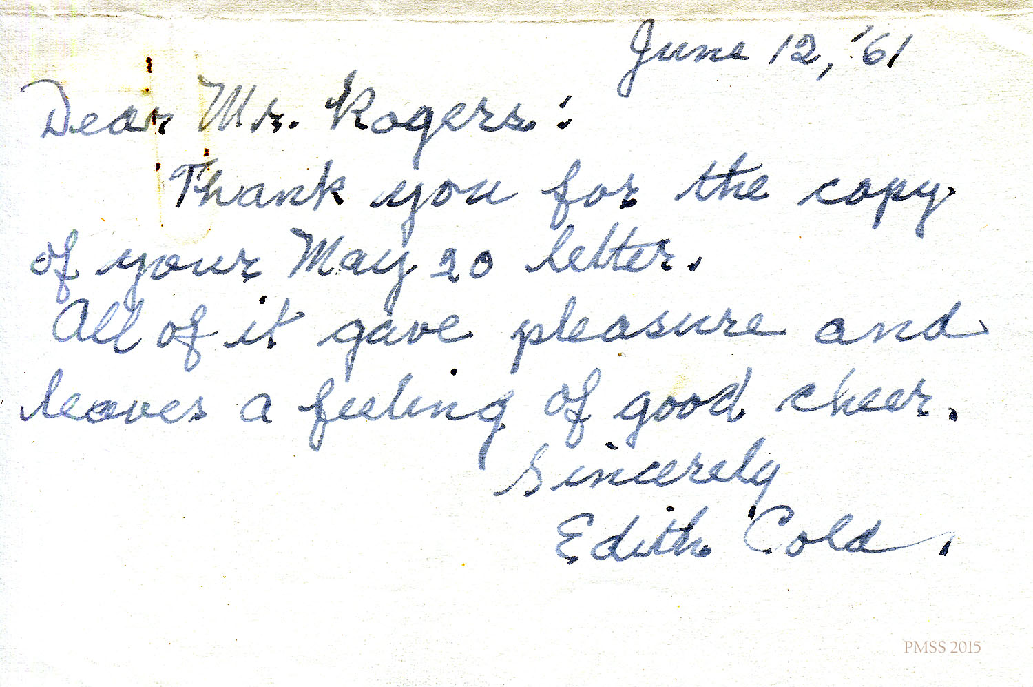 Dear Miss Cold: The Rogers family is on vacation, as you surmised, but I know that Burton would want me to thank you for your very generous gift of $5.00, and to tell you a bit about development which have “sprung” since the newsletter was written.