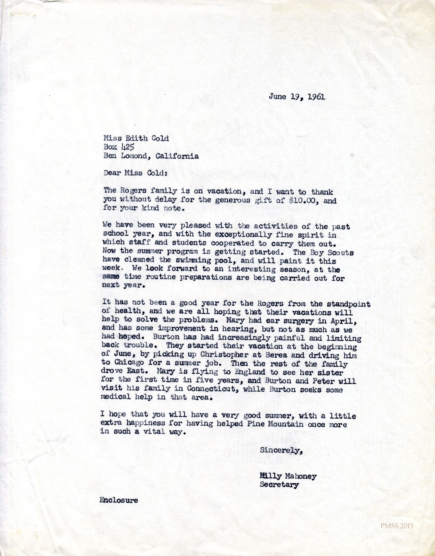 I hope that you will have a very good summer, with a little extra happiness for having helped Pine Mountain once more in such a vital way. Sincerely, [unsigned] Milly Mahoney Secretary Enclosure