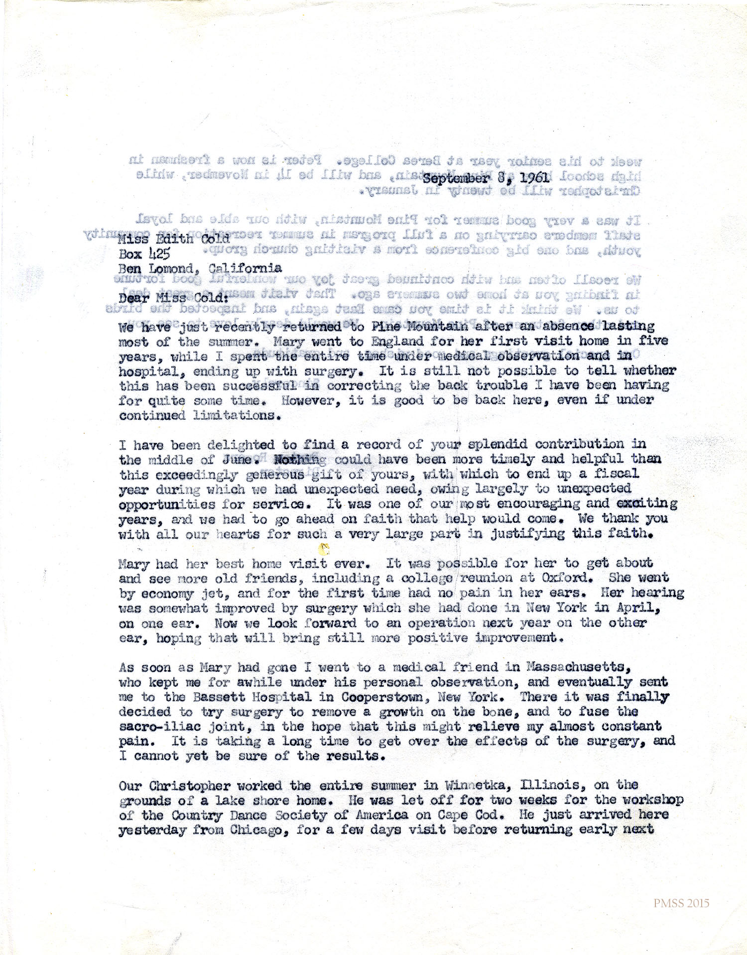 Dear Miss Cold: We have just recently returned to Pine Mountain after an absence lasting most of the summer. Mary went to England for her first visit home in five years, while I spent the entire time under medical observation and in hospital, ending up with surgery. It is still not possible to tell whether this has been successful in correcting the back trouble I have been having for quite some time. However, it is good to be back here, even if under continued limitations.