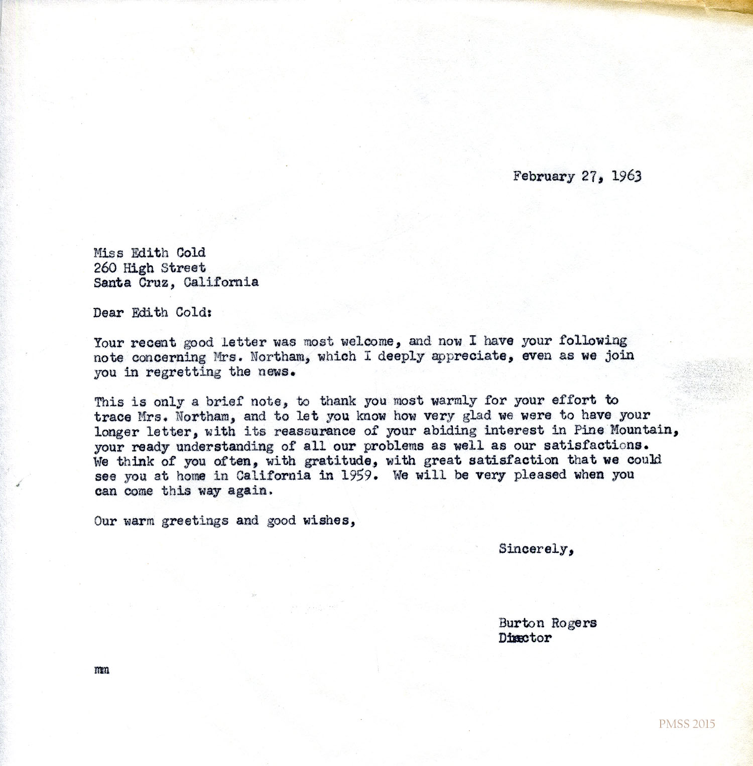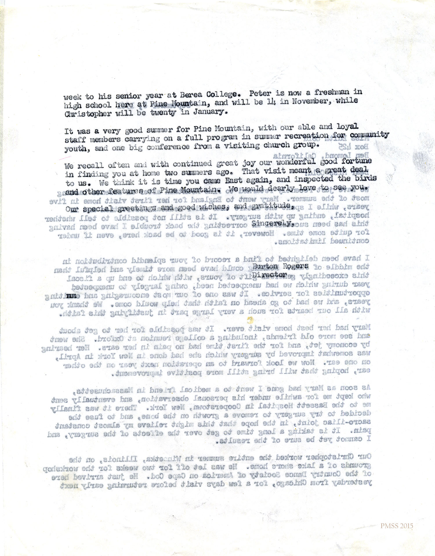 We send our best wishes for all your endeavors, along with thanks for what you have done for Pine Mountain, and the hope that you are enjoying a good summer. Sincerely yours, [unsigned] Burton Rogers, Director [This name was added by mistake. Burton’s letter of September 17, 1959, indicates that the actual author of this letter was “Miss [Mildred] Mahoney.”]