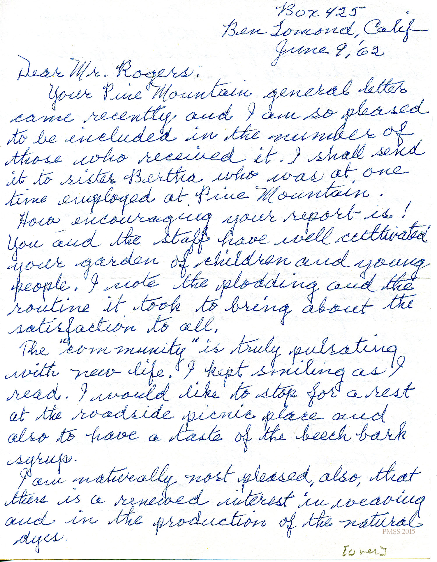 Dear Mr. Rogers: Your Pine Mountain general letter came recently and I am so pleased to be included in the number of those who received it. I shall send it to sister Bertha who was at one time employed at Pine Mountain.