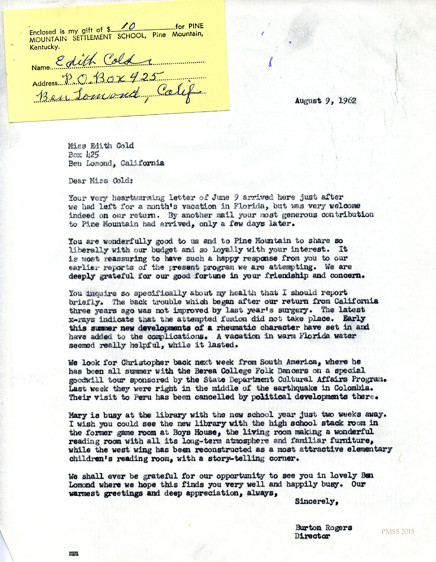 [Attached gift card] Enclosed is my gift of $10 for PINE MOUNTAIN SETTLEMENT SCHOOL, Pine Mountain, Kentucky. Name Edith Cold Address P.O. Box 425 Ben Lomond, Calif