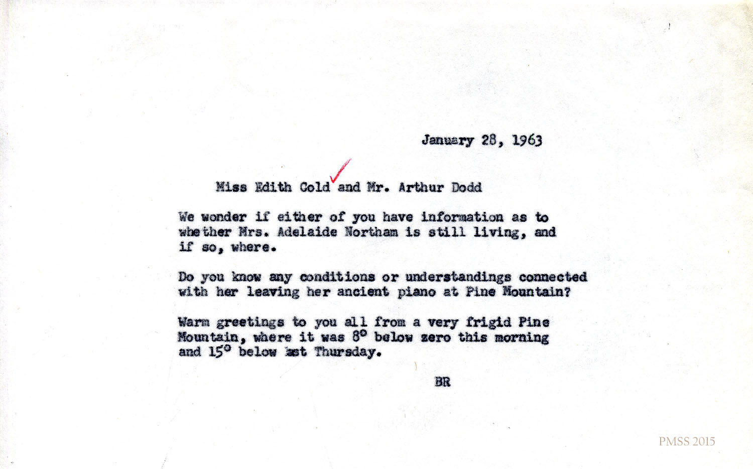 Do you know any conditions or understandings connected with her leaving her ancient piano at Pine Mountain?