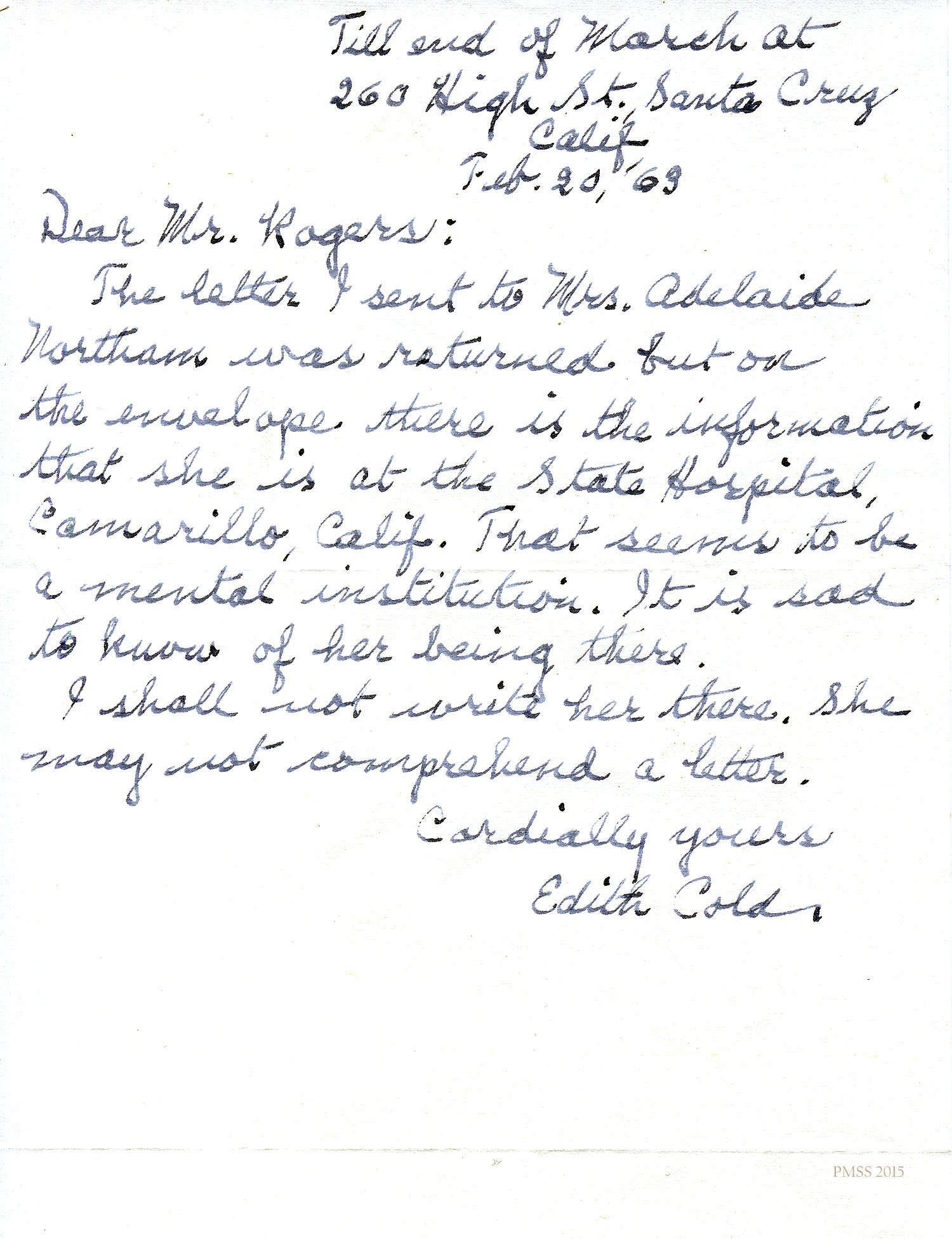 Dear Mr. Rogers: The letter I sent to Mrs. Adelaide Northam was returned but on the envelope there is the information that she is at the State Hospital, Camarillo, Calif. That seems to be a mental institution. It is sad to know of her being there.