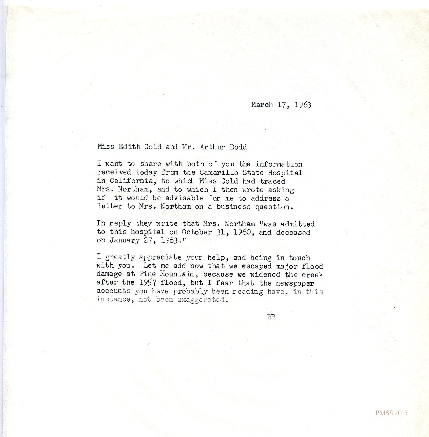 Miss Edith Cold and Mr. Arthur Dodd, I want to share with both of you the information received today from the Camarillo State Hospital in California, to which Miss Cold had traced Mrs. Northam, and to which I then wrote asking if it would be advisable for me to address a letter to Mrs. Northam on a business question.